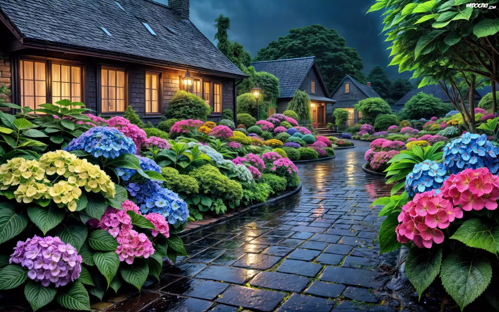 Zdjęcia, Domy, Kolorowe, Hortensje, Droga, Grafika