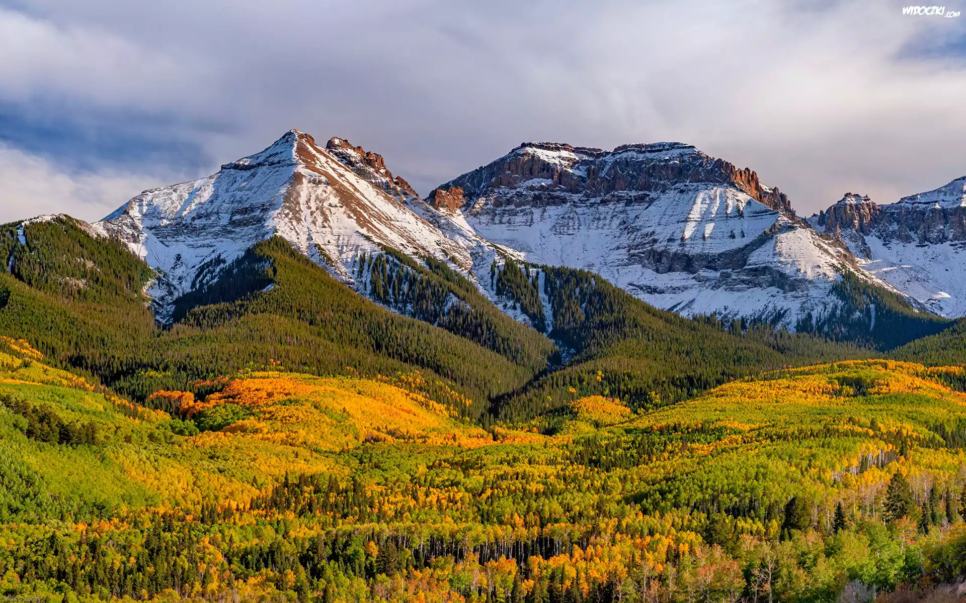 Zdjęcia, Ośnieżone, Góry, Lasy, Kolorowe, Drzewa, Jesień