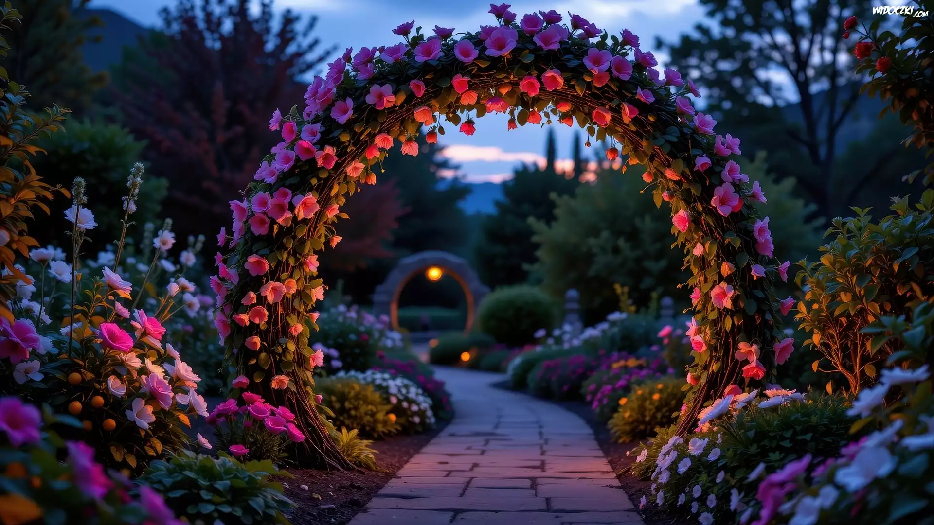 Zdjęcia, Ogród, Kwiatowy, Łuk, Kolorowe, Kwiaty, Drzewa, Alejka