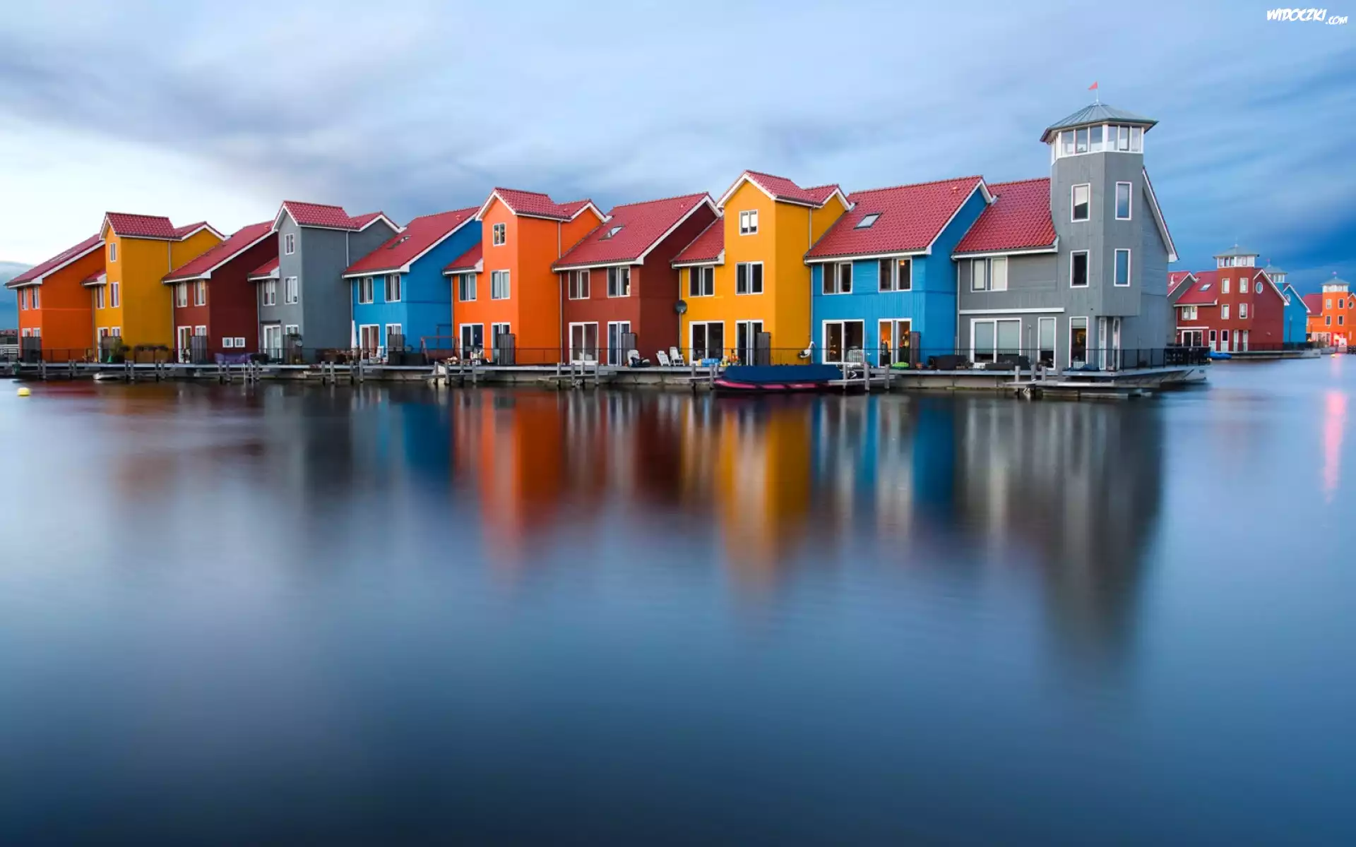 Zdj臋cia, Kolorowe, Domy, Morze, Niebo, Odbicie