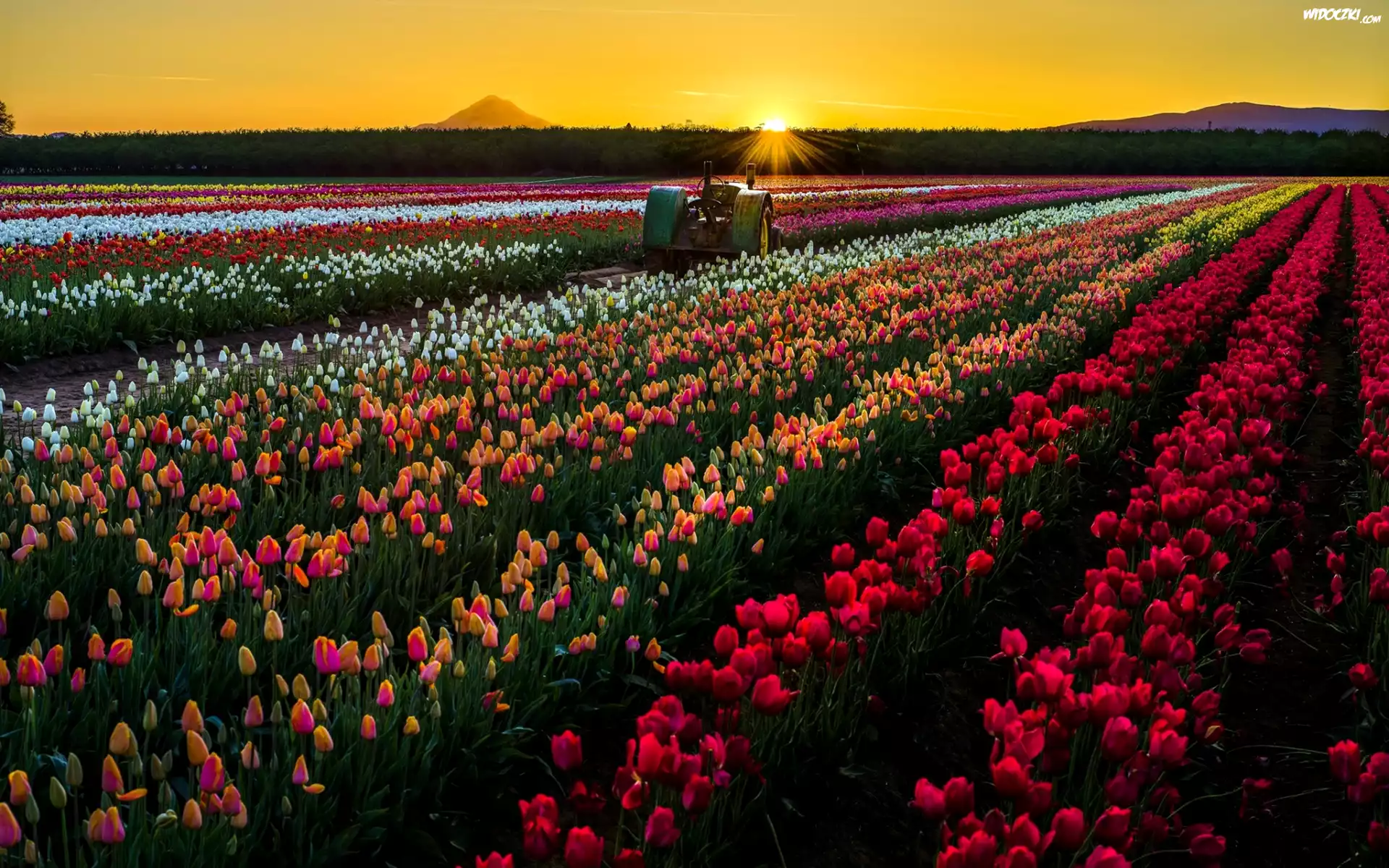 Zdjęcia, Pole, Kolorowe, Tulipany, Zachód, Słońca, Ciągnik, Rolniczy