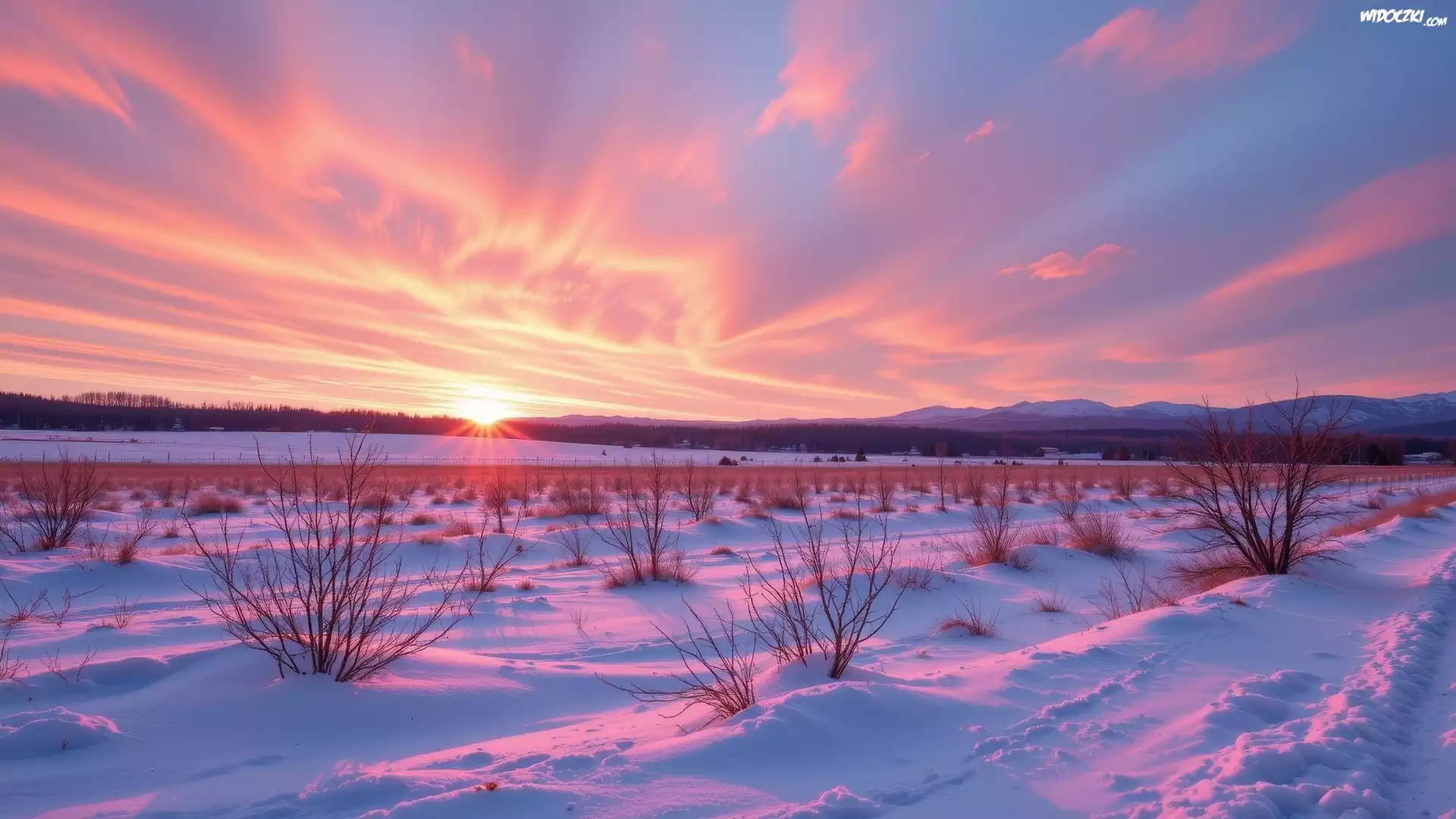 Zdjęcia, Zima, Zachód słońca, Kolorowe, Niebo, Ośnieżone, Pola