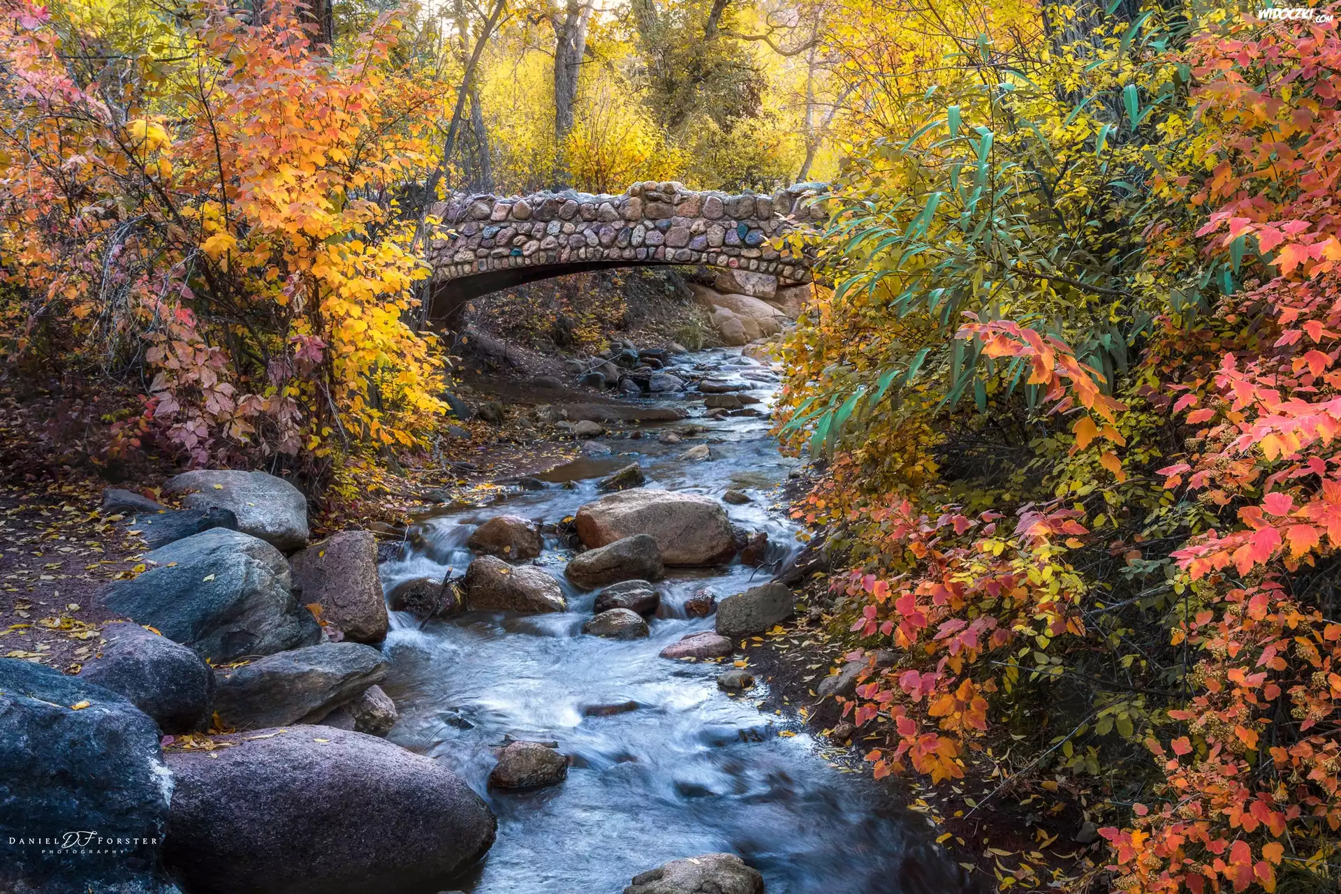 Jesień, Potok, North Cheyenne Creek, Kamienie, Most, Kolorowe, Drzewa, Krzewy, Colorado Springs, Kolorado, Stany Zjednoczone |