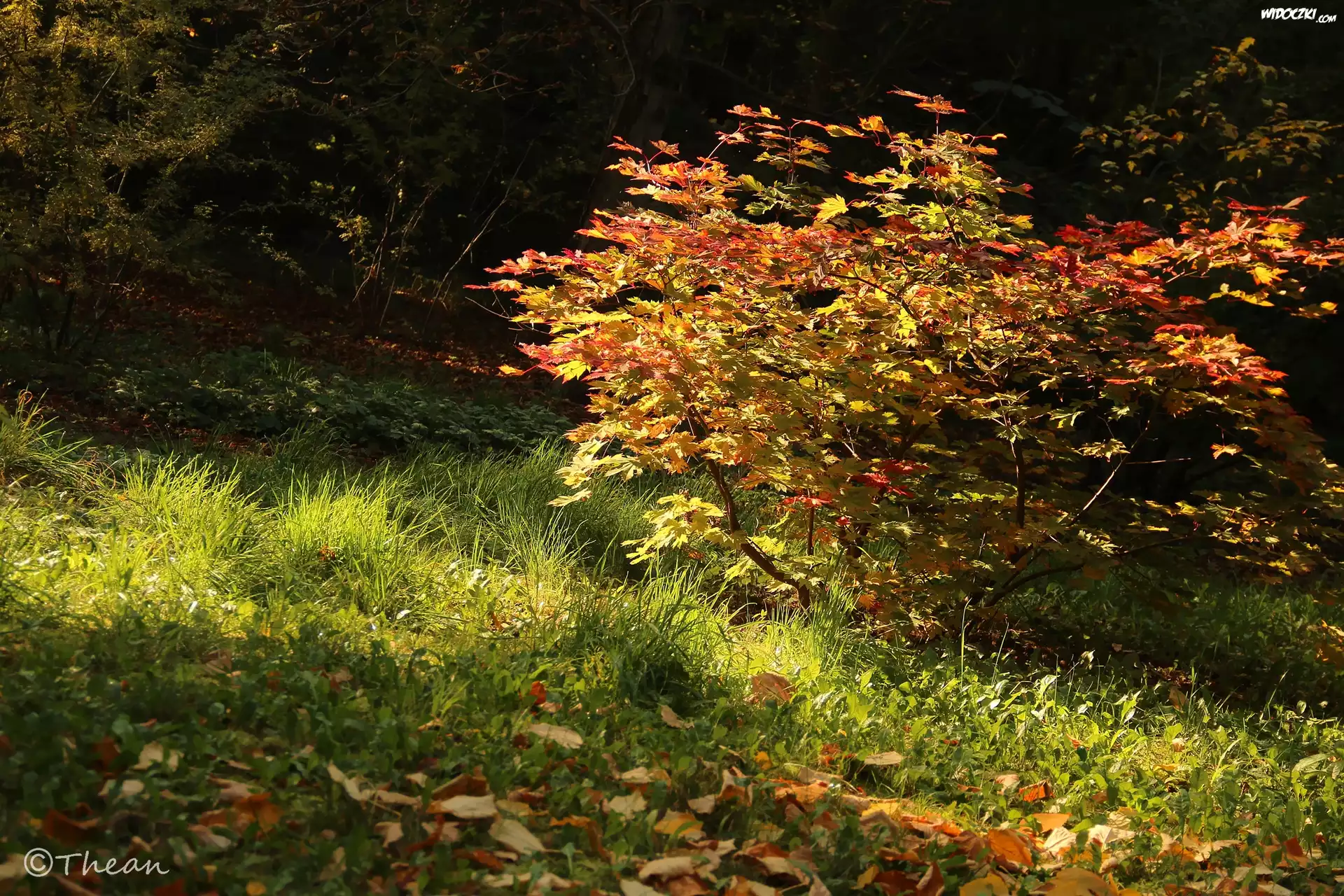Zdjęcia, Kolorowe, Liście, Drzewko, Trawa, Jesień
