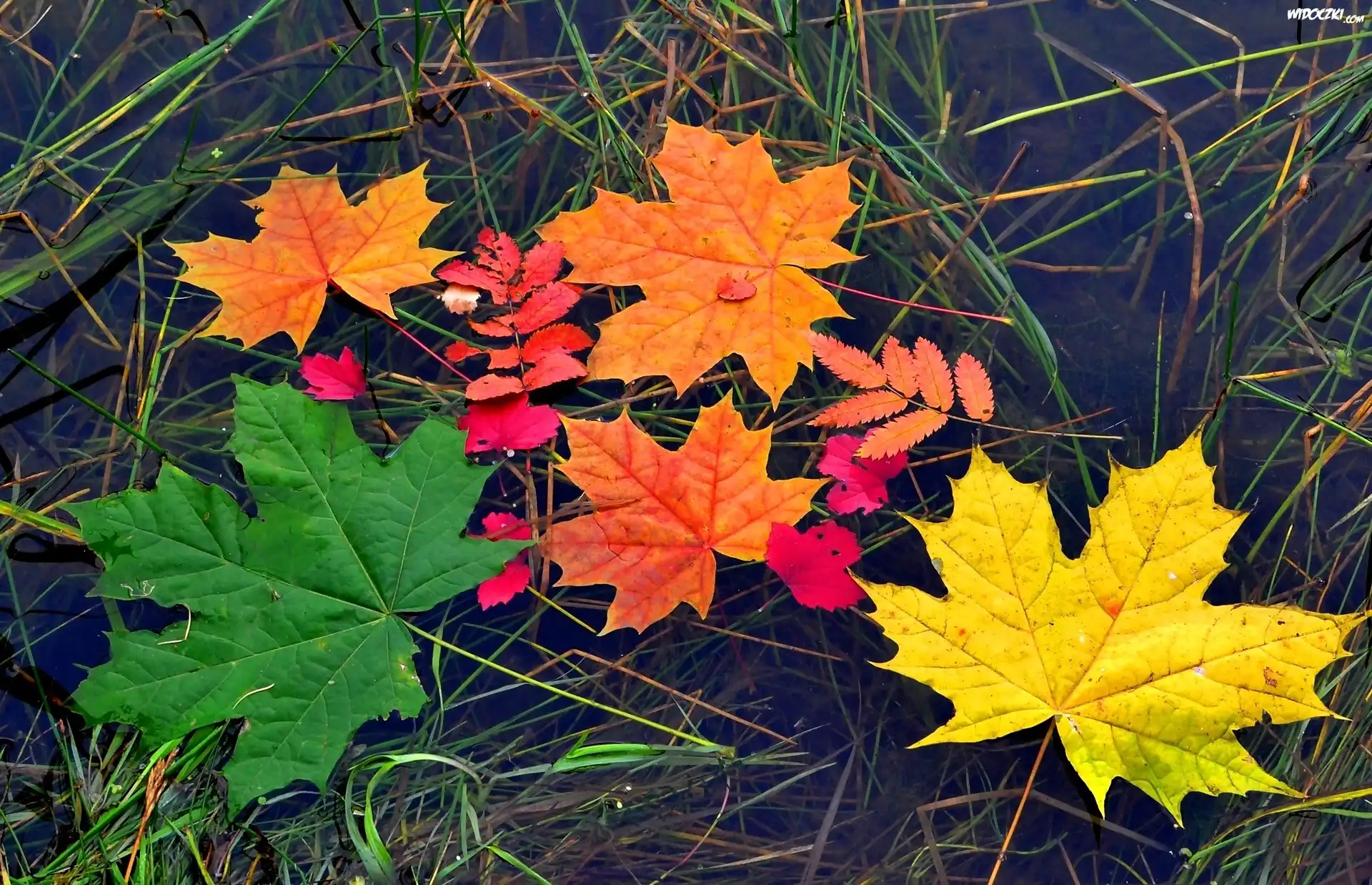 Zdjęcia, Kolorowe liście, Woda, Jesień
