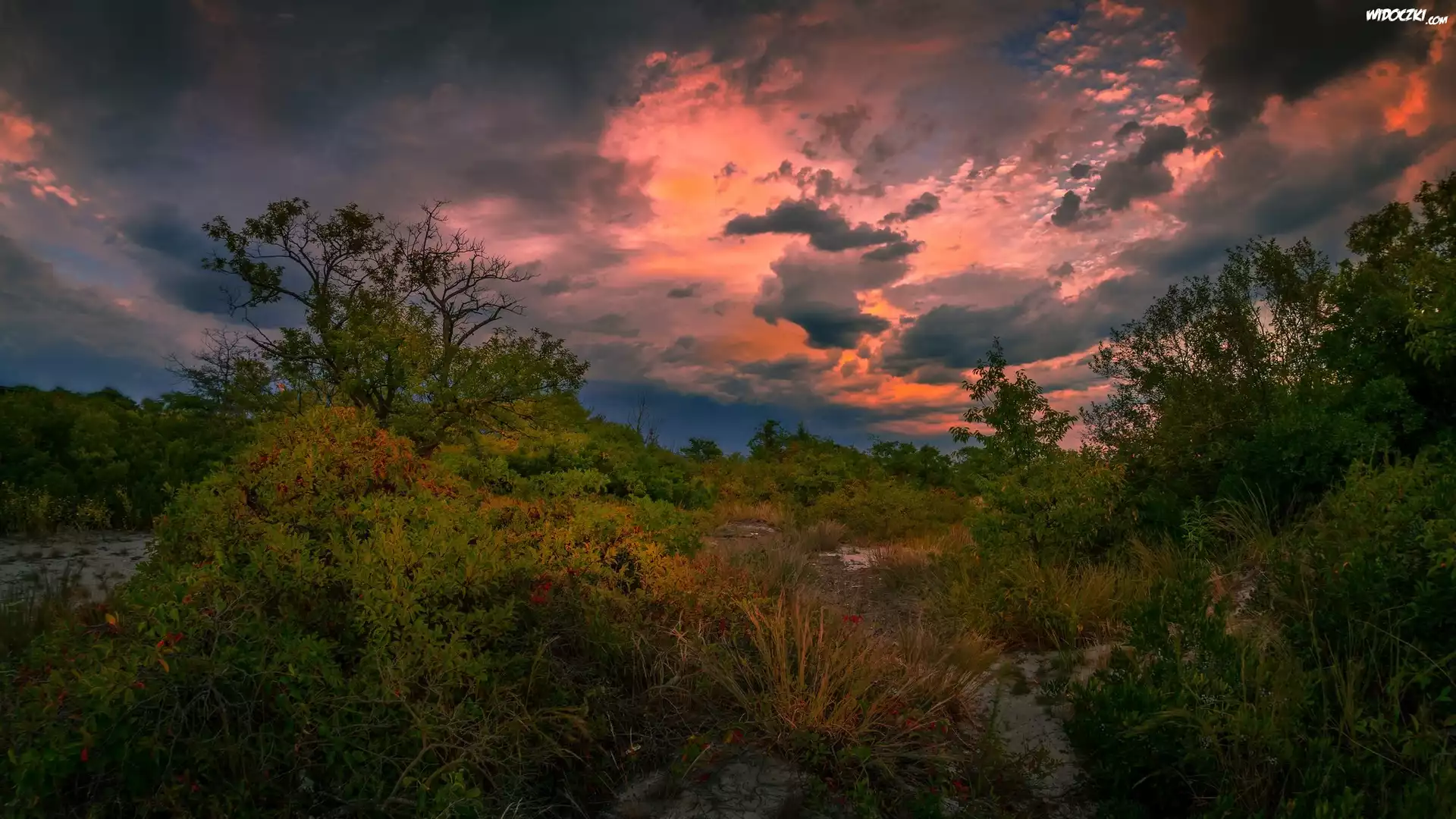 Kolorowe, Niebo, Drzewa, Rośliny, Zachód słońca