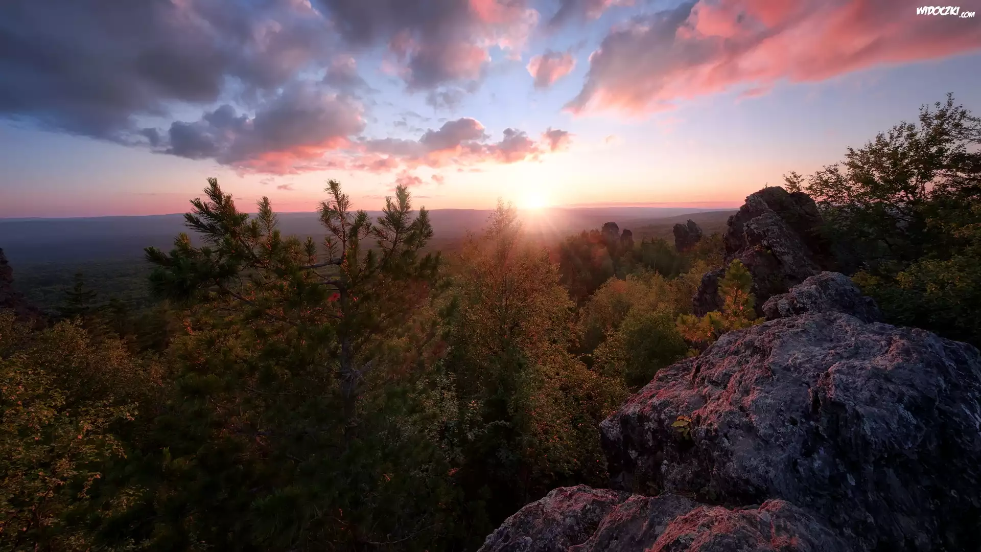 Skały, Góra Kolpaki, Drzewa, Świt, Wschód słońca, Ural, Kraj Permski, Rosja
