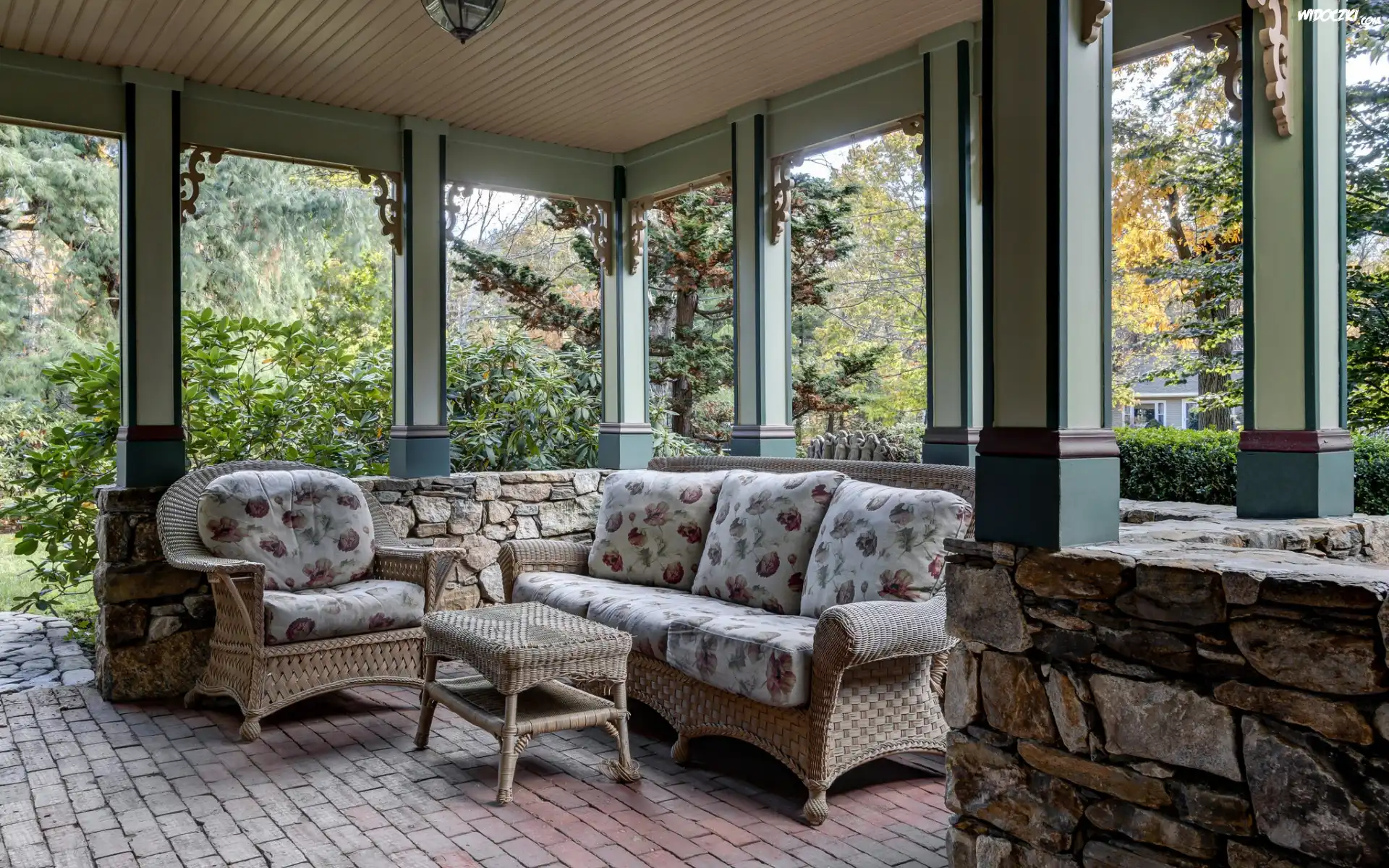 Weranda, Kolumny, Meble, Sofa, Fotel, Stół, Ogród, Drzewa