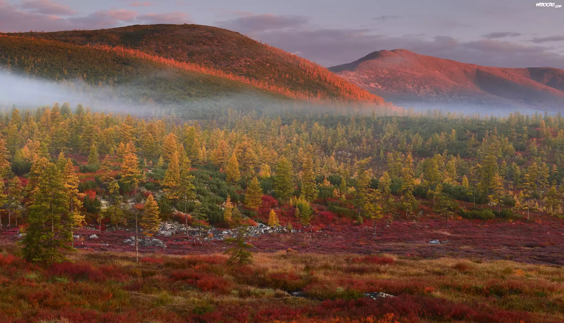 Zdjęcia, Jesień, Góry Kołymskie, Mgła, Drzewa, Trawa, Rośliny, Rosja, Kołyma