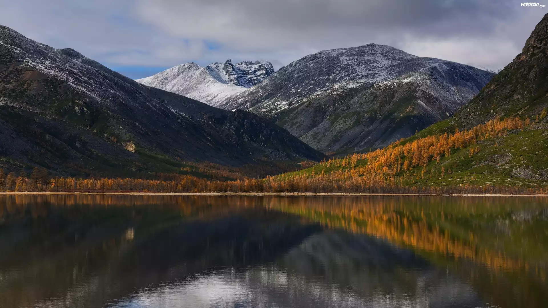 Jesień, Góry Kołymskie, Drzewa, Jezioro Jack London, Kołyma, Obwód magadański, Rosja