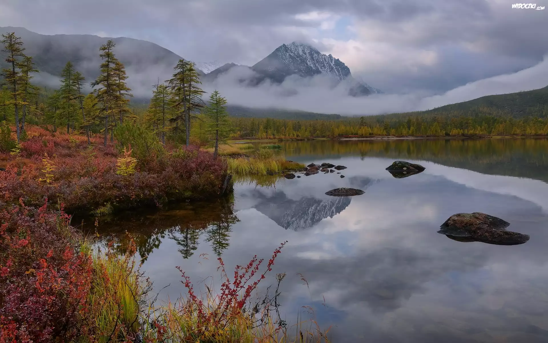 Jesień, Góry Kołymskie, Jezioro Nevidimka, Drzewa, Trawa, Kołyma, Obwód magadański, Rosja