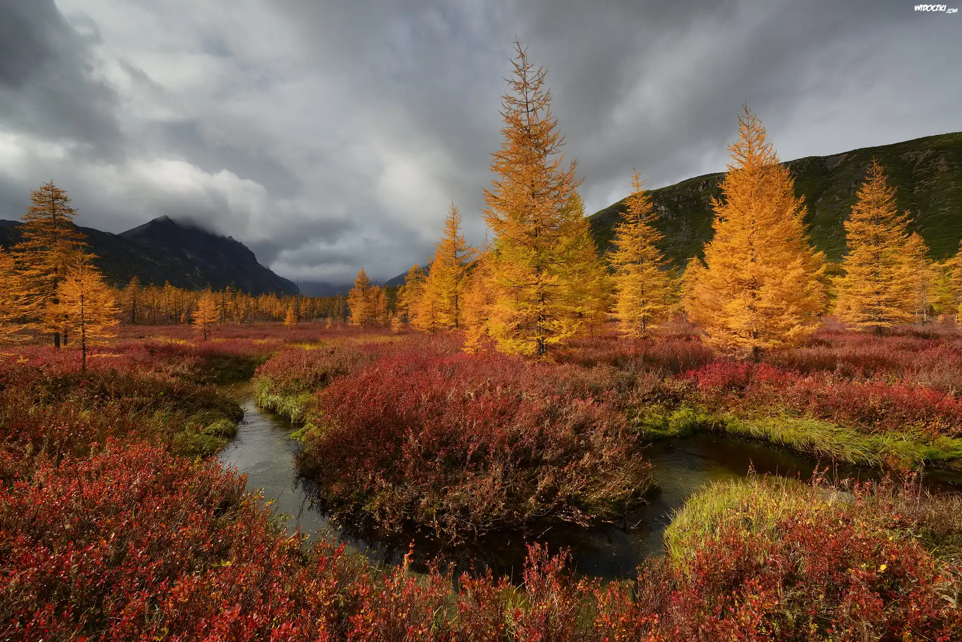 Jesień, Góry Kołymskie, Drzewa, Rzeka, Kolorowa, Roślinność, Kołyma, Obwód magadański, Rosja |