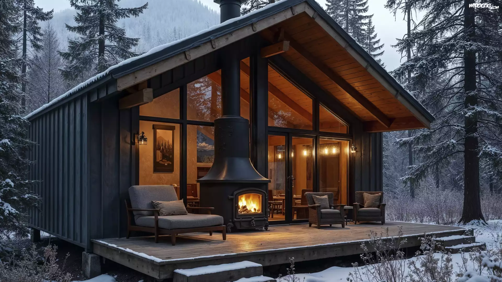 Zima, Dom, Taras, Kominek, Fotele, Las