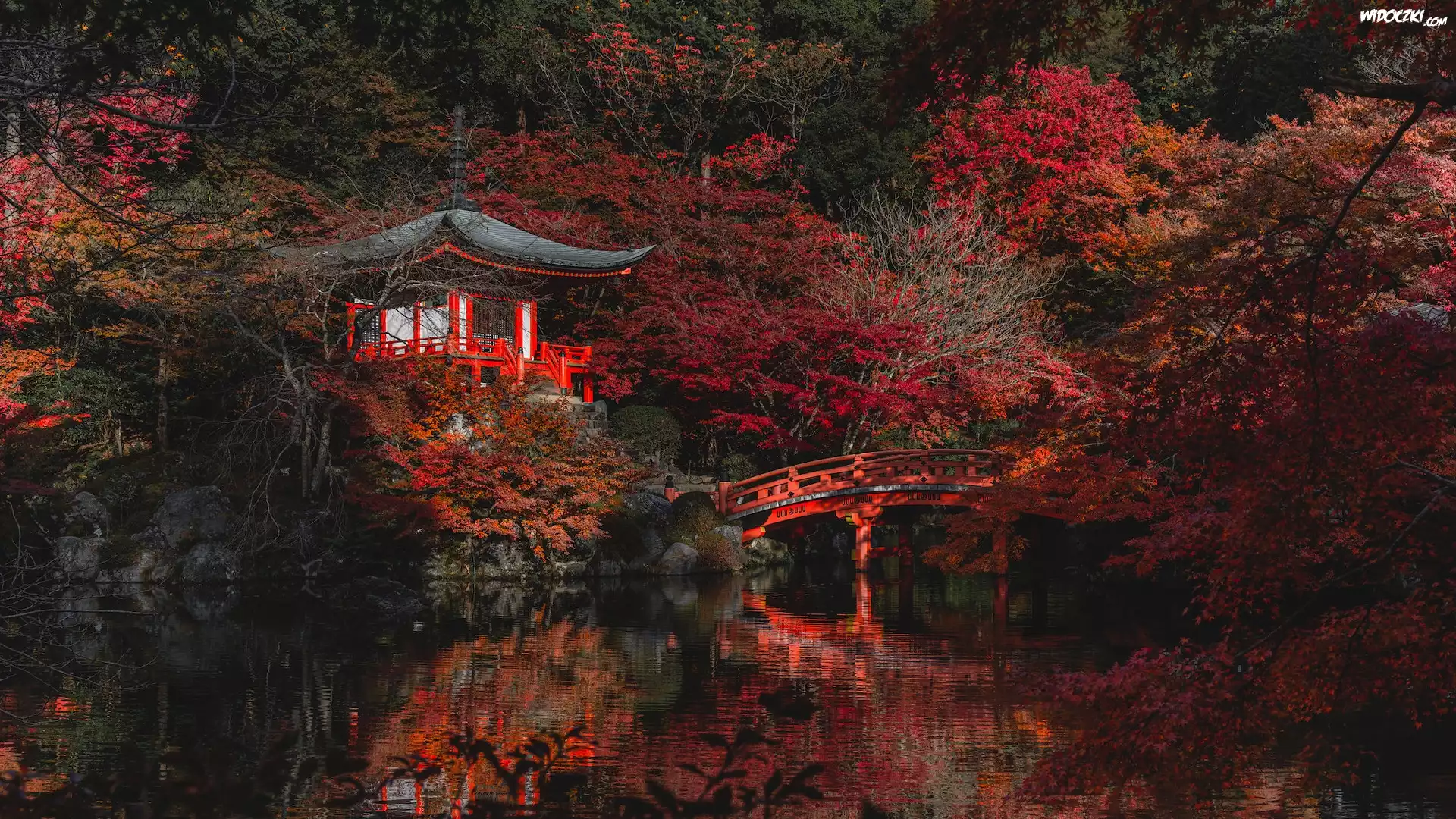 Zdjęcia, Japonia, Kioto, Świątynia, Bentendo Temple, Kompleks Daigo-ji, Drzewa, Mostek, Jesień, Odbicie