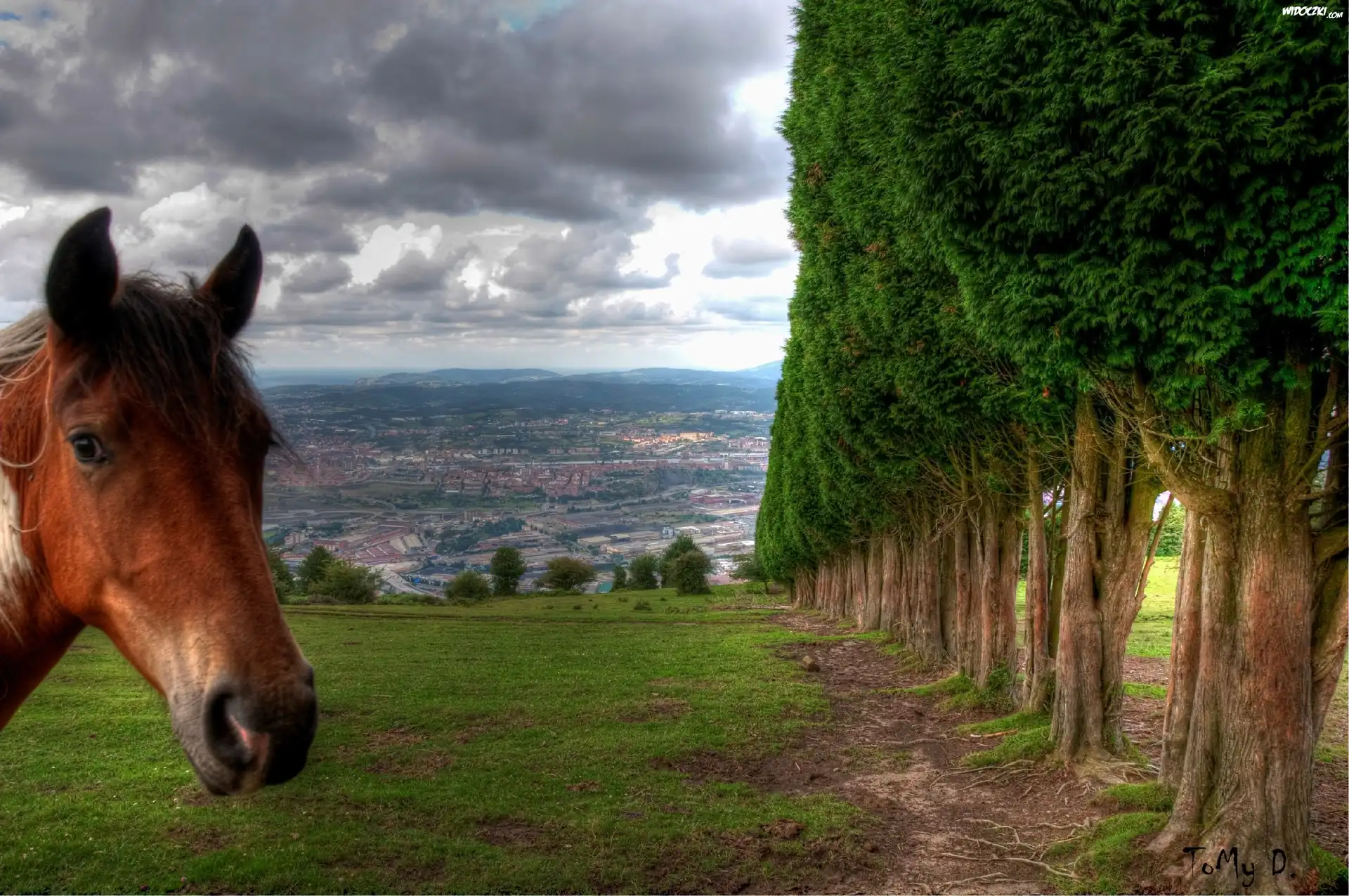 Zdjęcia, Koń, Łeb, Łąka, Drzewa
