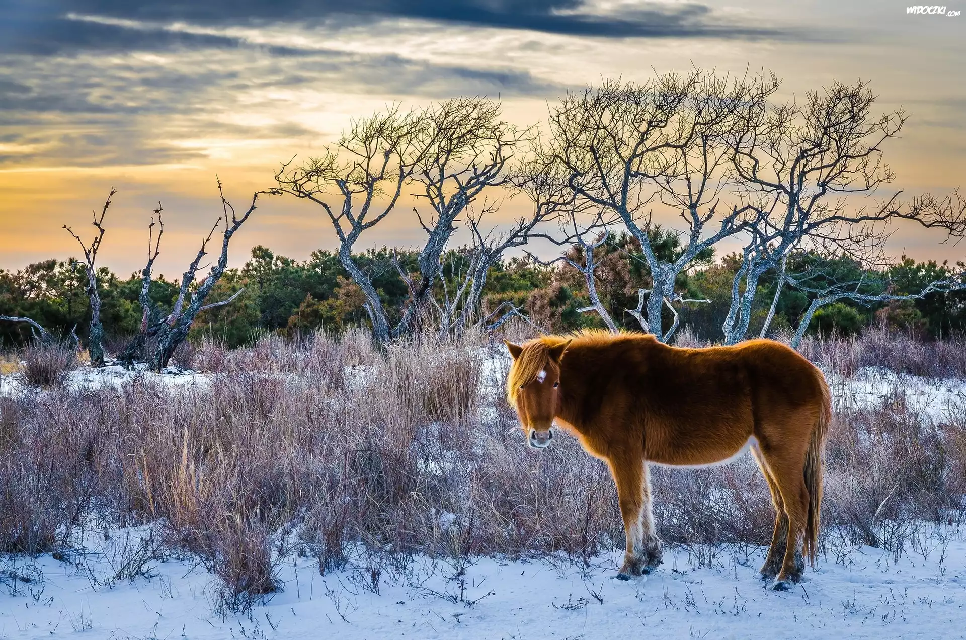 Koń, Trawy, Drzewa, Śnieg