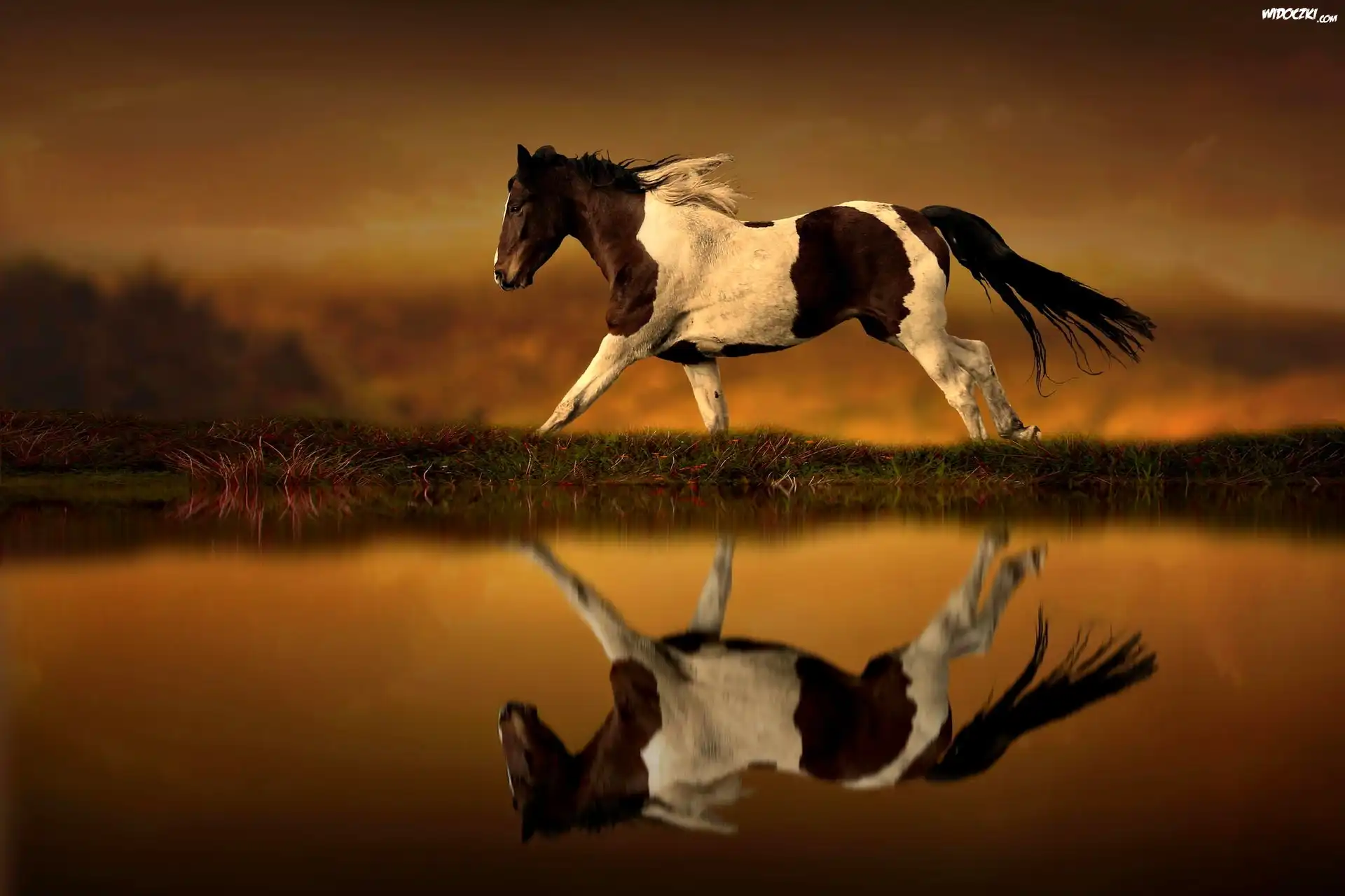 Koń, Zachód Słońca, Woda, Odbicie