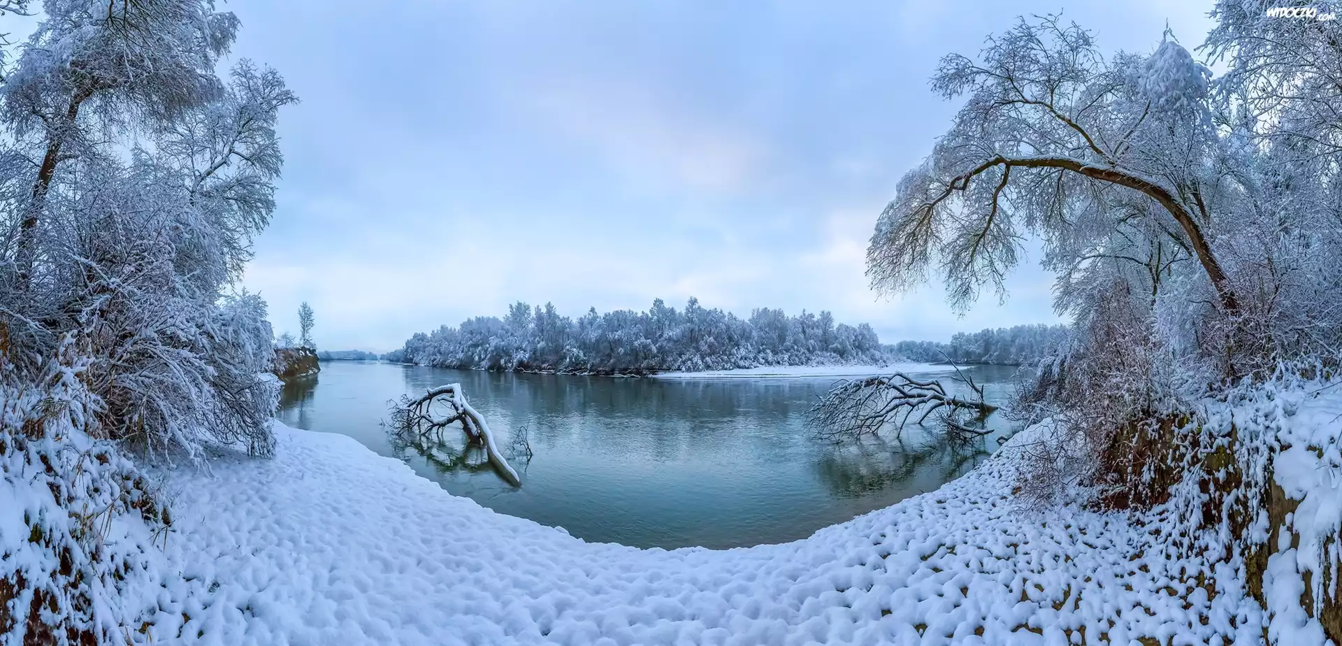 Rosja, Kraj Stawropolski, Rzeka Terek, Zima, Drzewa, Åšnieg, Konary