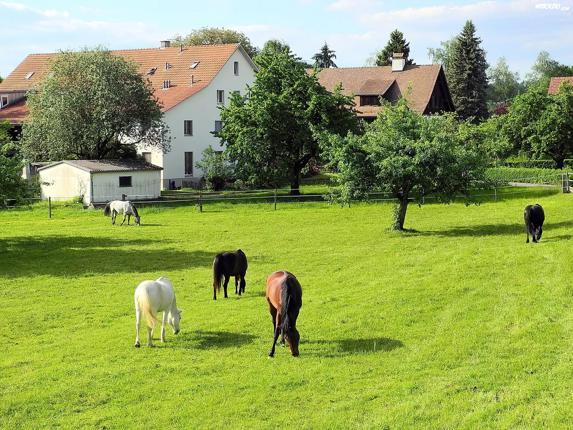 Zdjęcia, Konie, Łąka, Domy, Drzewa