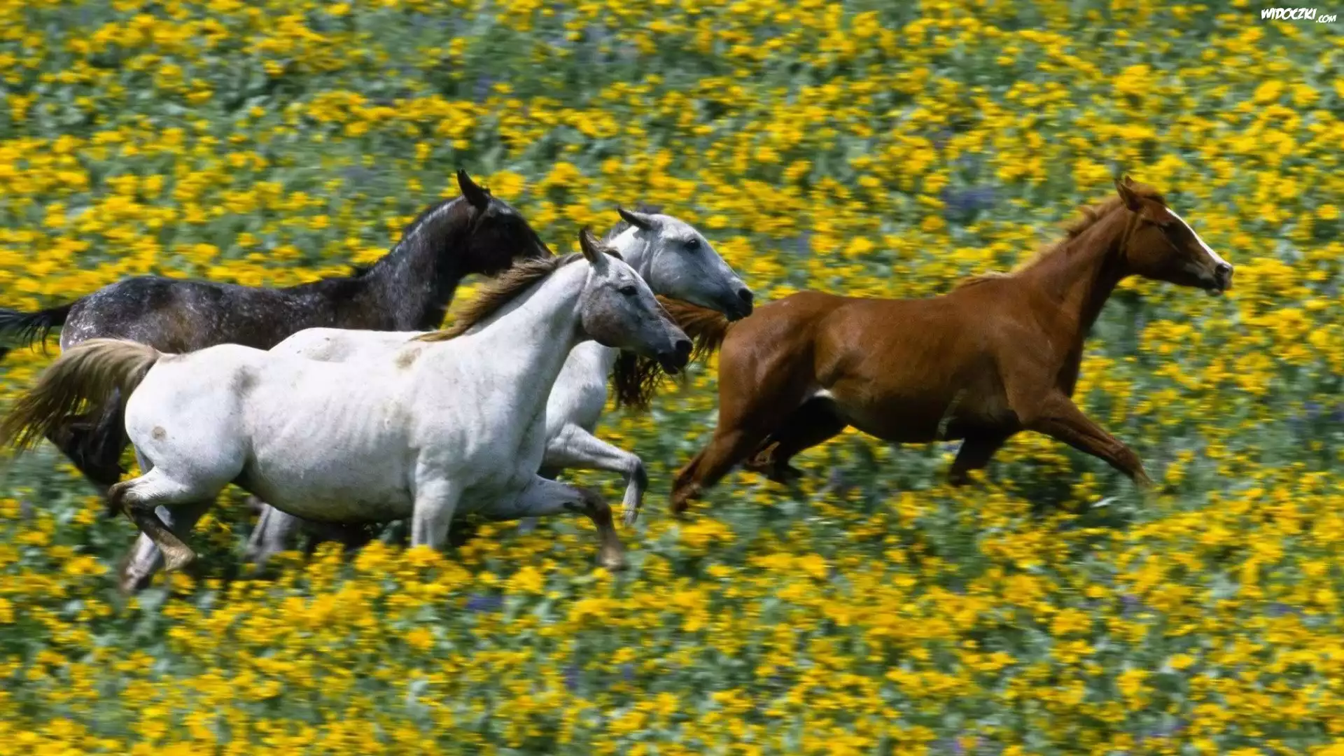 Zdjęcia, Konie, Łąka, Żółte, Kwiaty