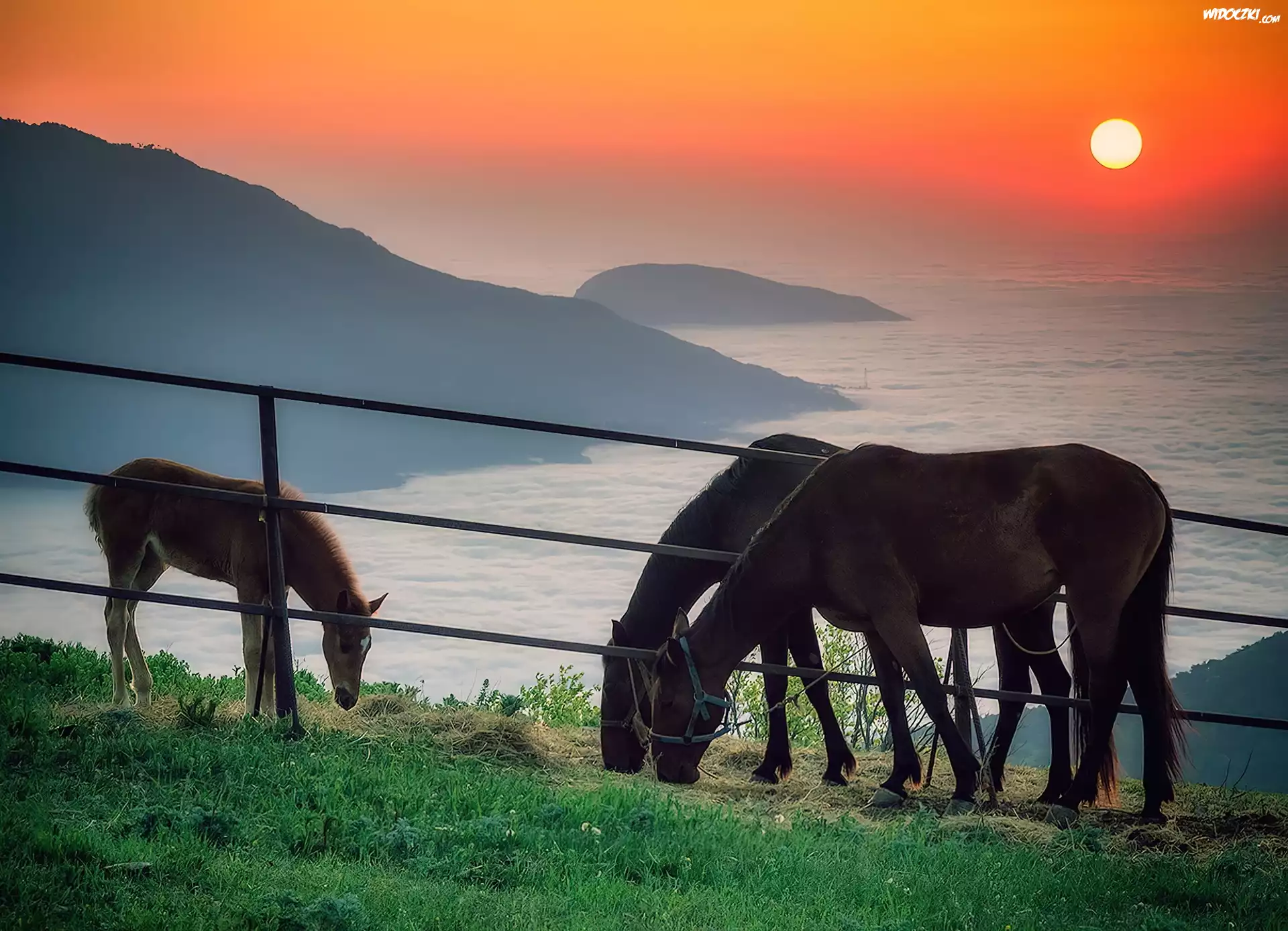 Konie, Skały, Morze, Trawa, Zachód, Słońca