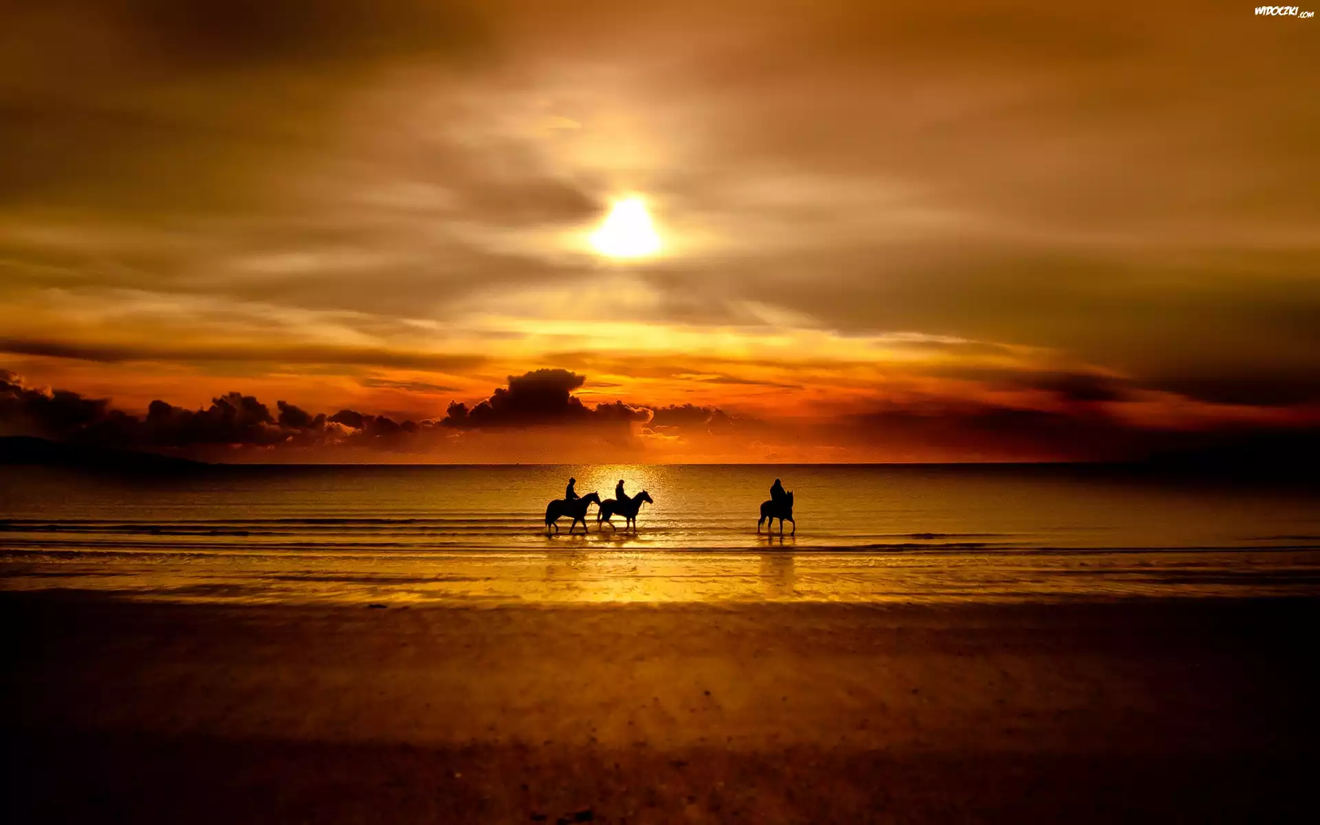 Konie, Morze, Plaża, Zachód, Słońca