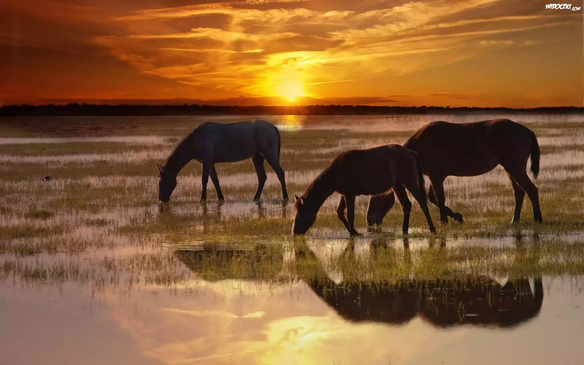 Zdjęcia, Konie, Rzeka, Zachód, Słońca