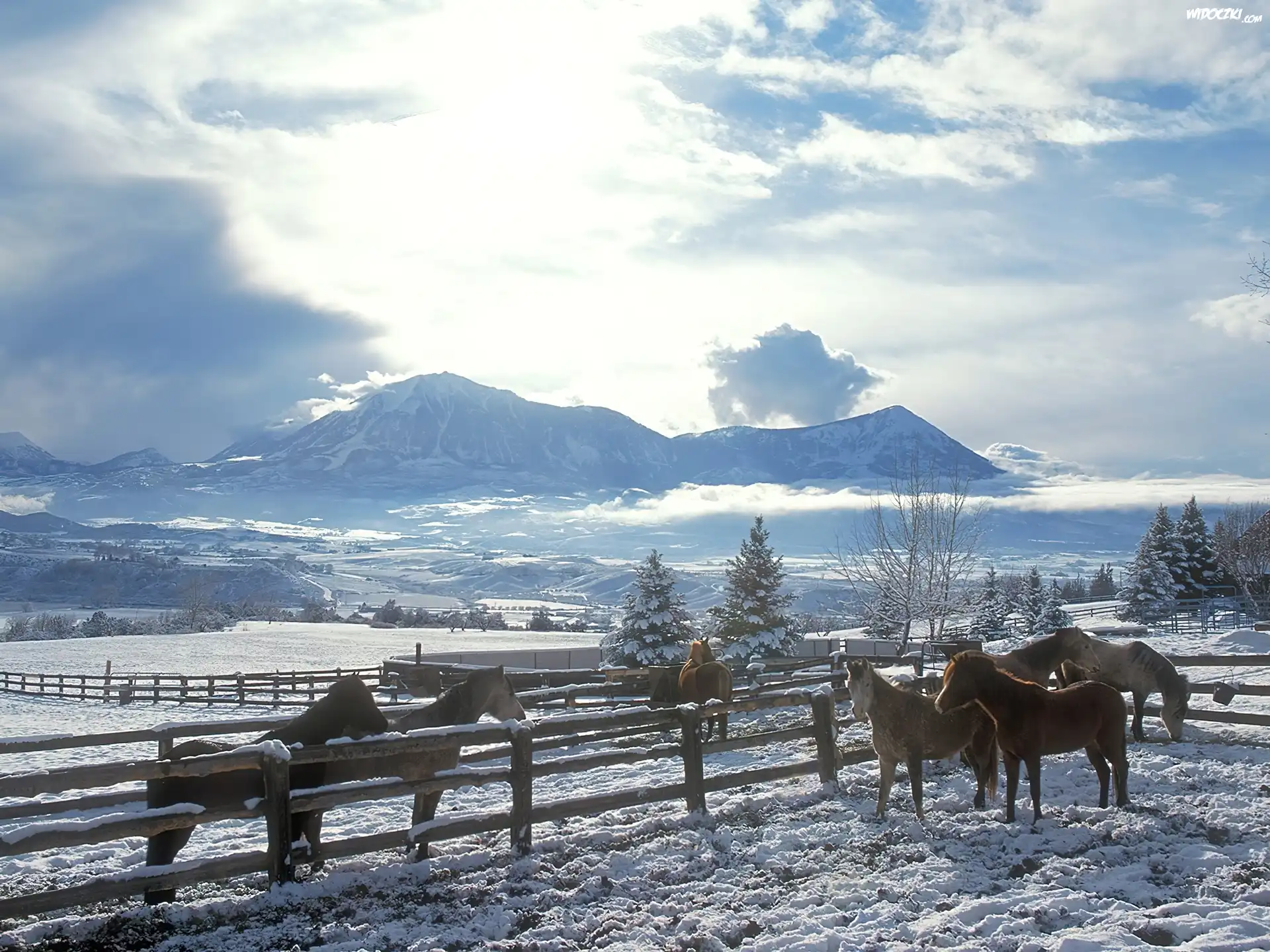 Zdjęcia, Konie, Zagroda, Zima, Góry