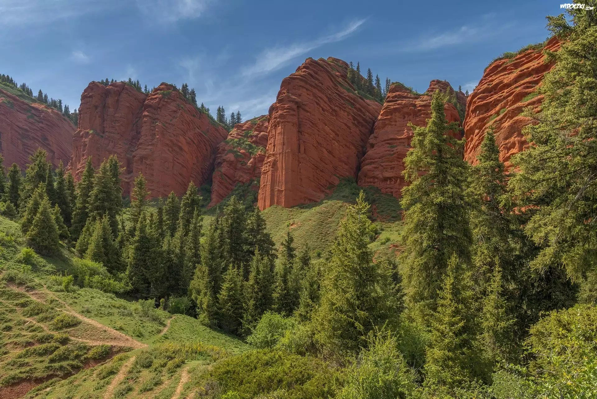 Zdjęcia, Kanion Konorchek Canyons, Skały, Góry, Drzewa, Ścieżki, Kirgistan