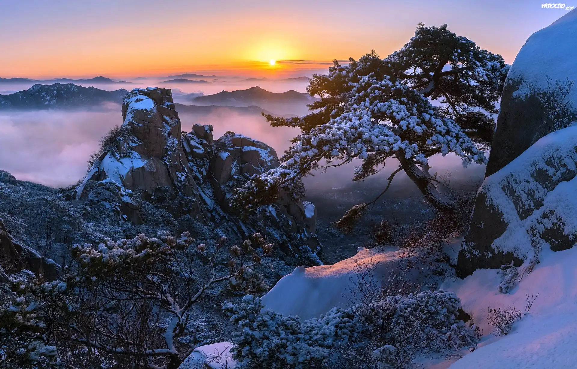 Korea Południowa, Prowincja Gyeonggi-do, Park Narodowy Bukhansan, Góra Dobongsan, Zima, Wschód słońca, Mgła, Skały, Drzewa, Sosna |