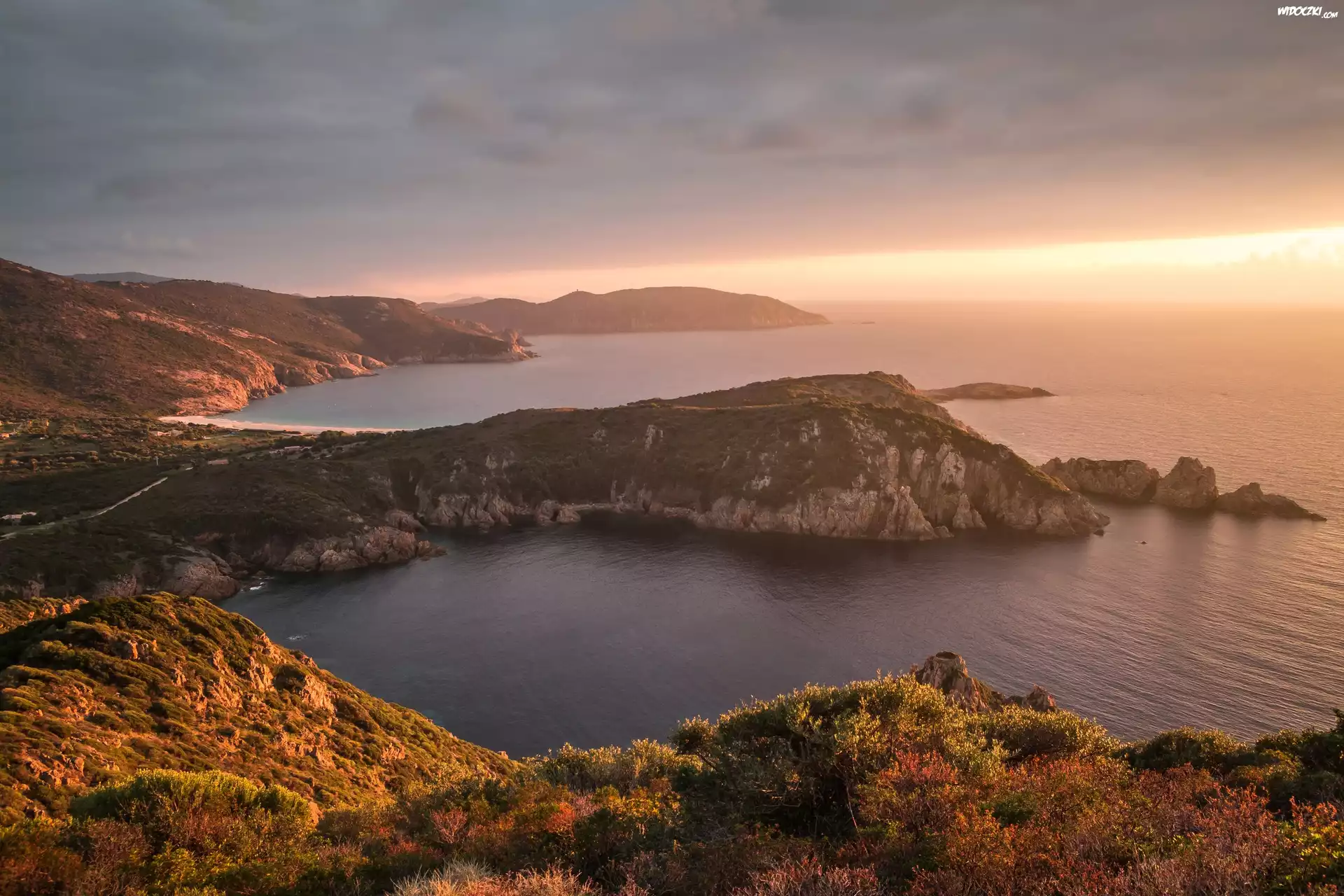 Francja, Korsyka, Morze, Zachód słońca, Skały, Wybrzeże