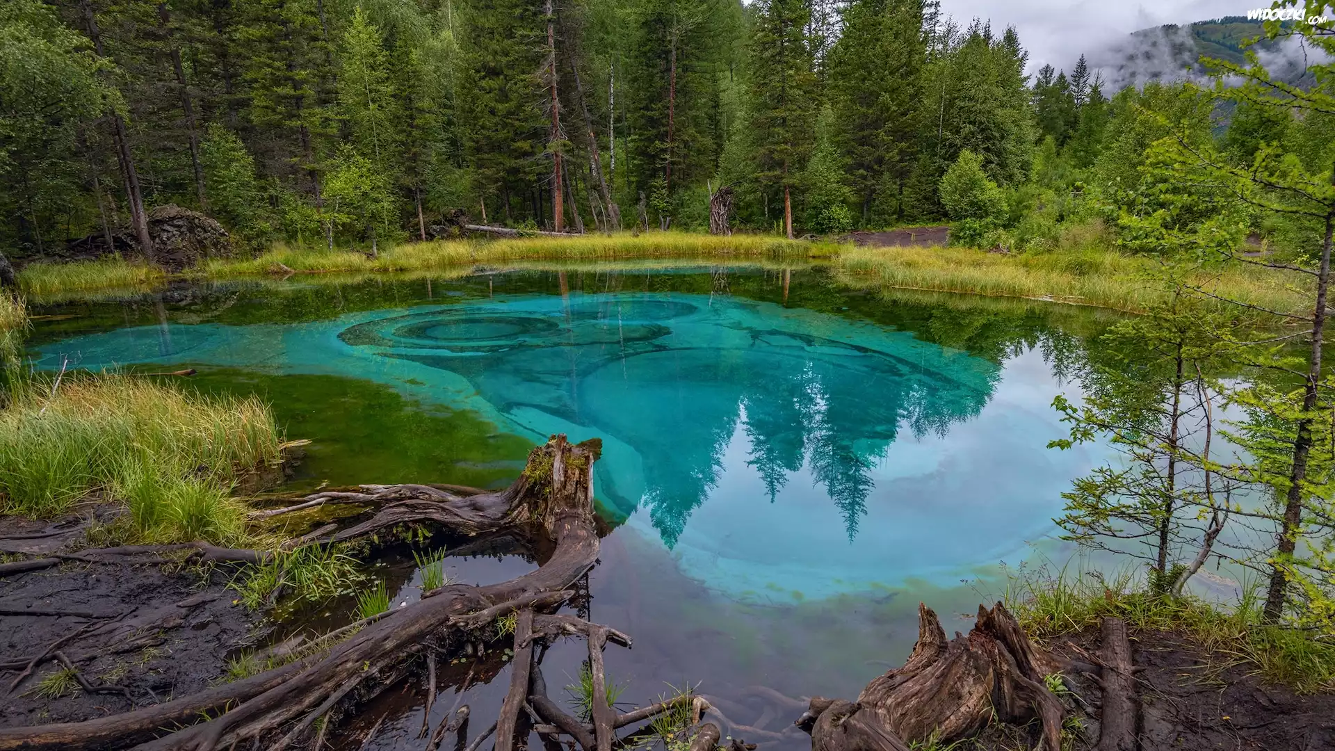 Rosja, Republika Ałtaju, Jezioro Geysernoe, Las, Drzewa, Trawa, Korzenie