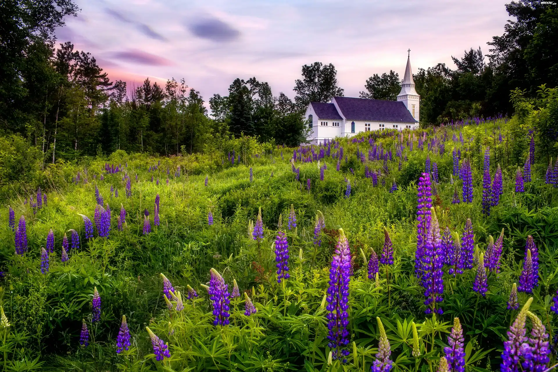 Kościół, Drzewa, Łąka, Łubin