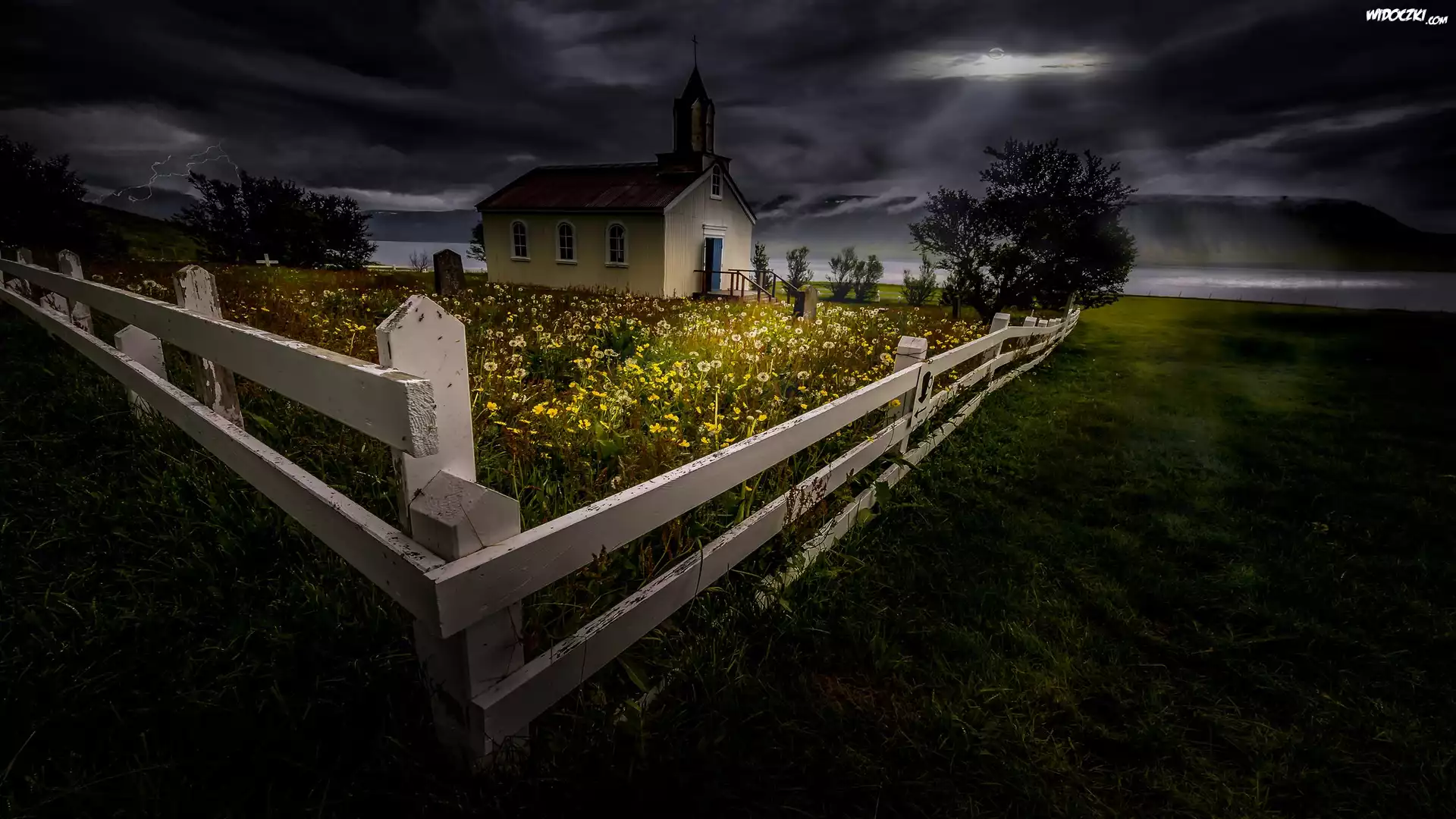 Kościół, Cmentarz, Płot, Kwiaty, Burza, Błyskawica