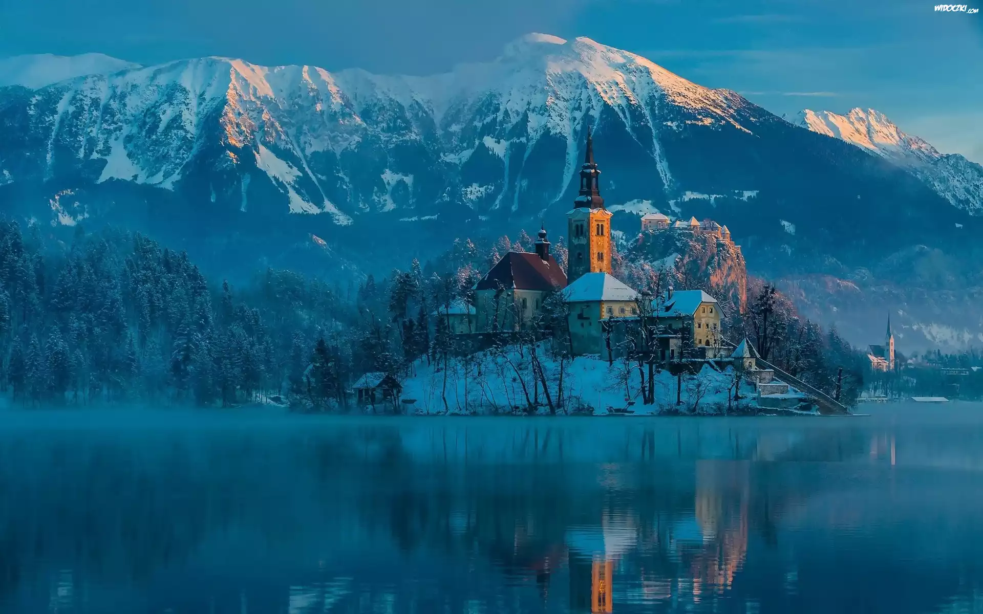 Zdjęcia, Domy, Kościół, Zima, Góry, Jezioro, Bled, Słowenia