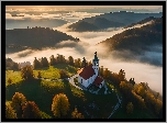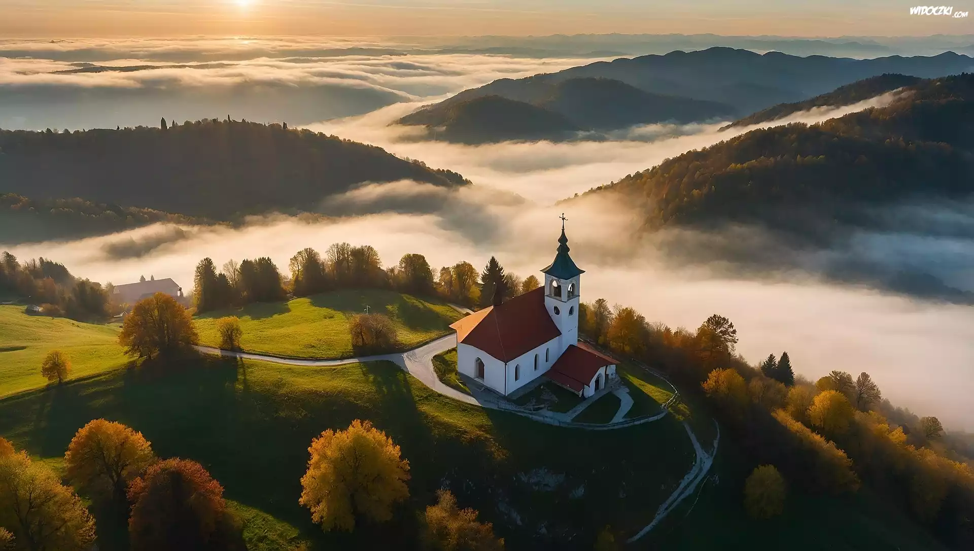 Zdjęcia, Góry, Jesień, Drzewa, Kościół, Mgła, Drzewa, AI