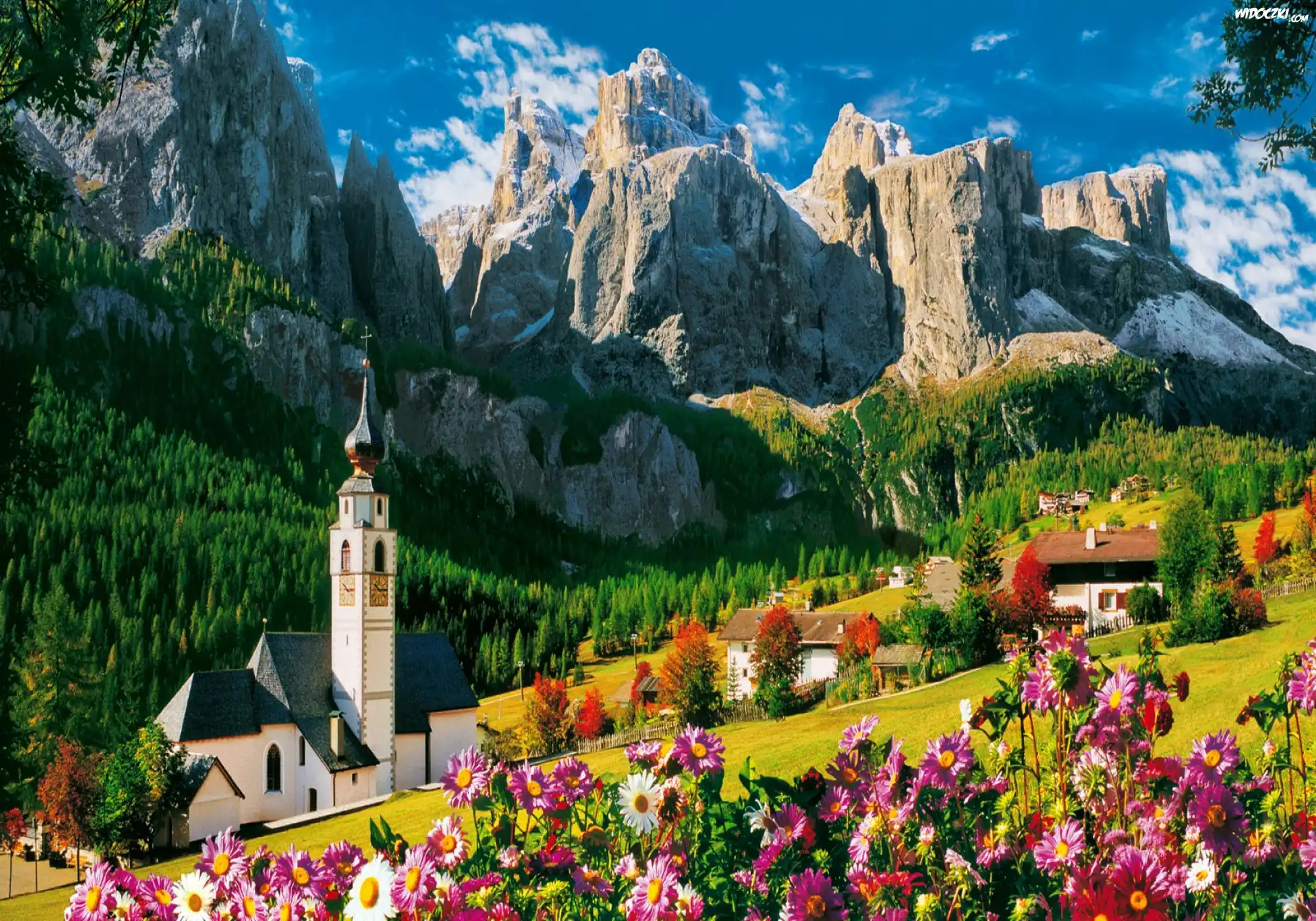 Kościół, Domy, Góry, Kwiaty
