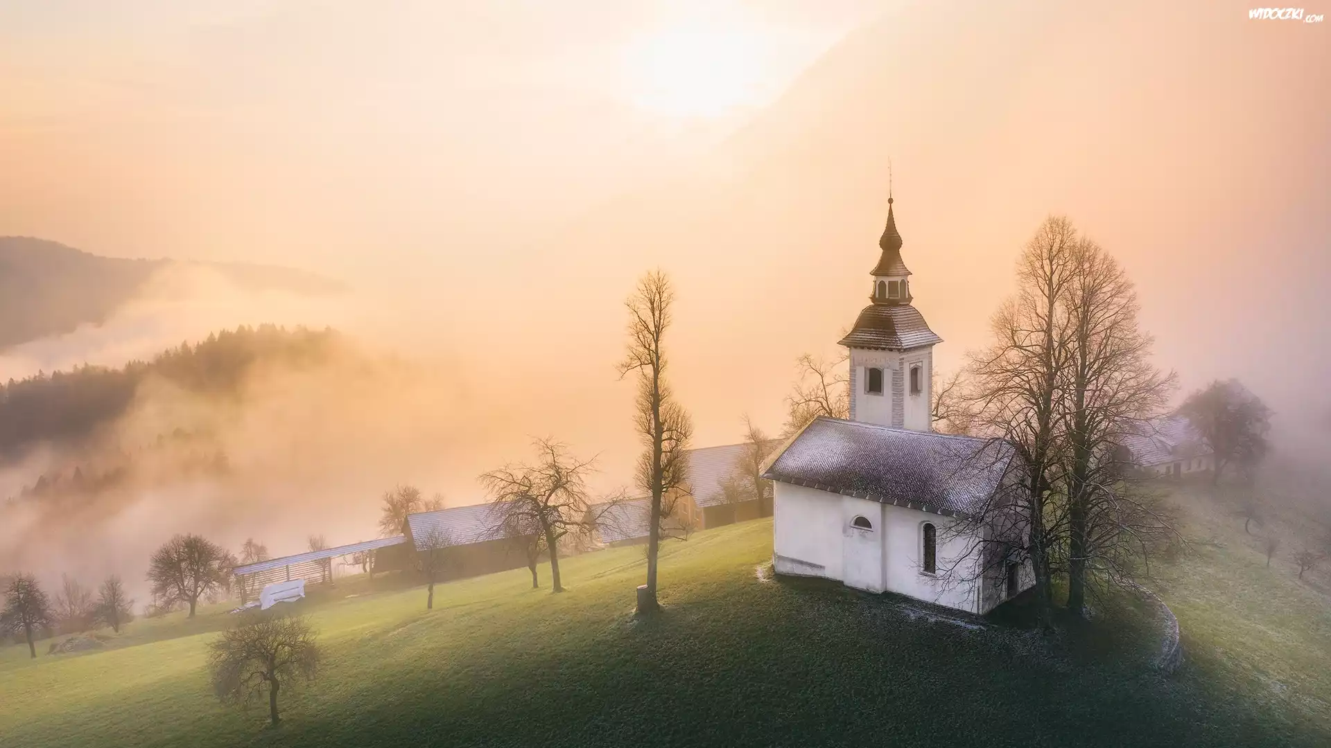 Kościół św Primusa i Felicjana, Przebijające światło, Mgła, Wzgórze, Góry, Drzewa, Jesień, Wieś Jamnik, Słowenia |