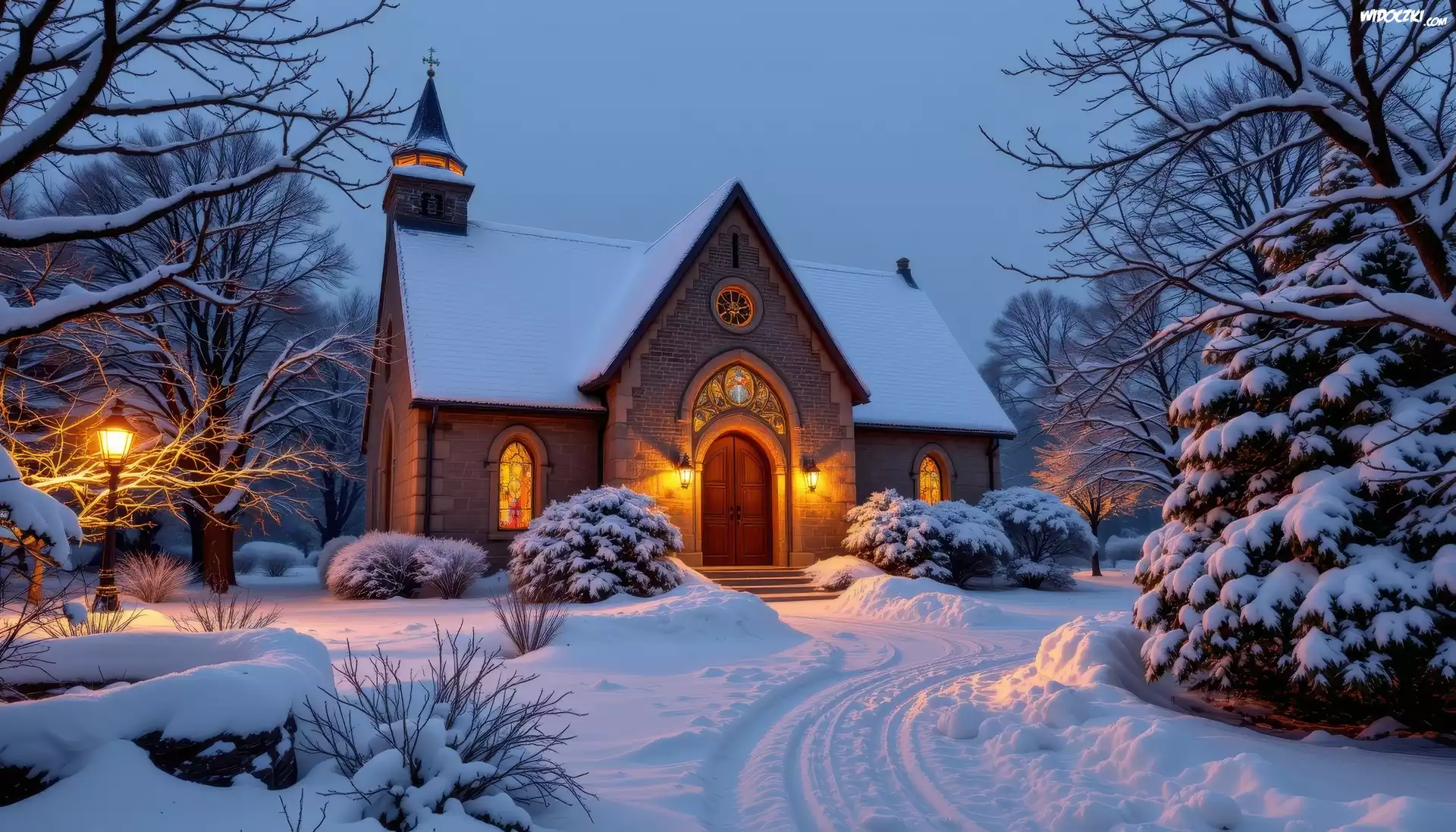 Zima, Kościół, Ośnieżone, Drzewa, Droga