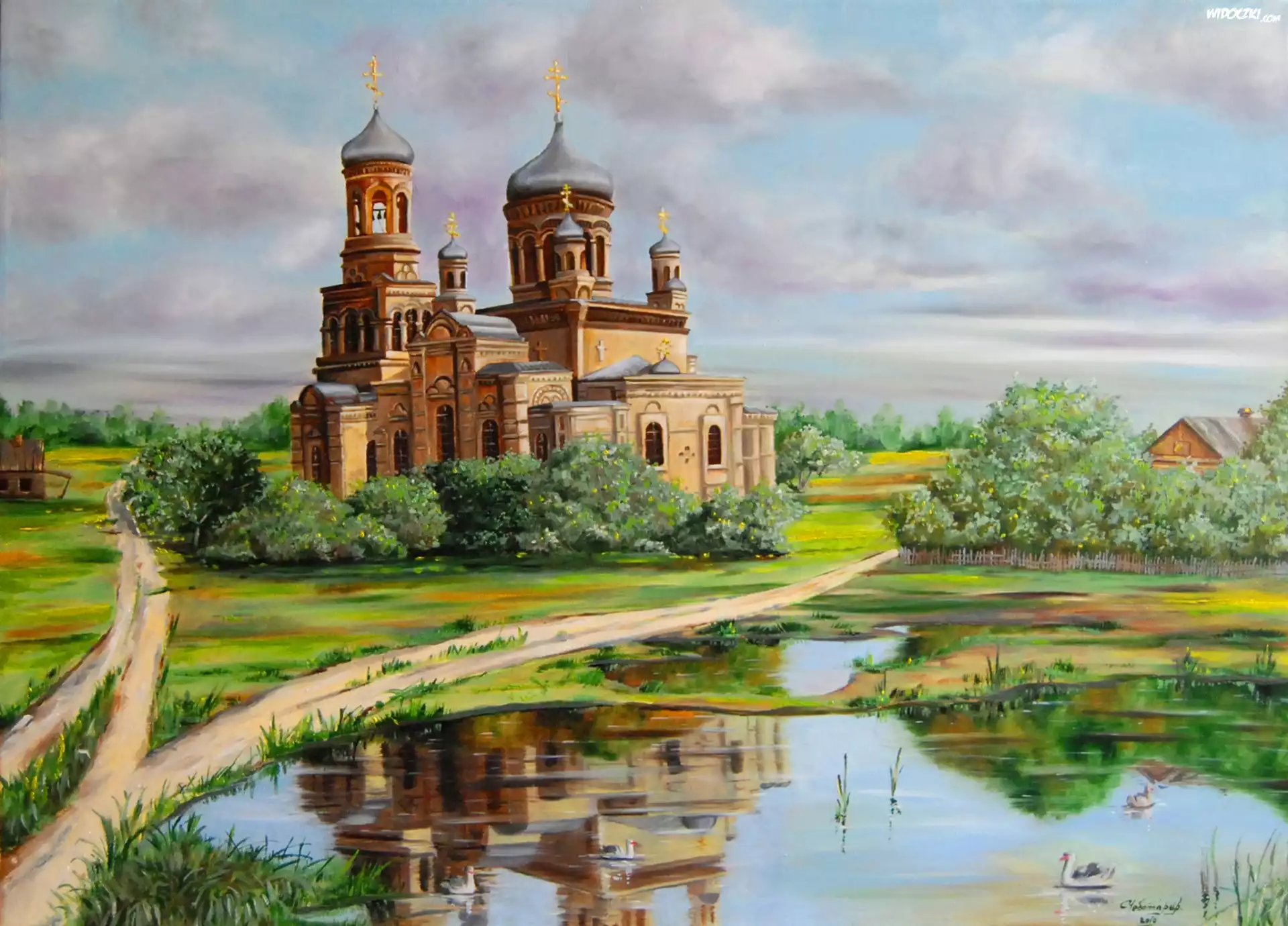 Zdjęcia, Kościół, Cerkiew, Dróżki, Staw, Odbicie