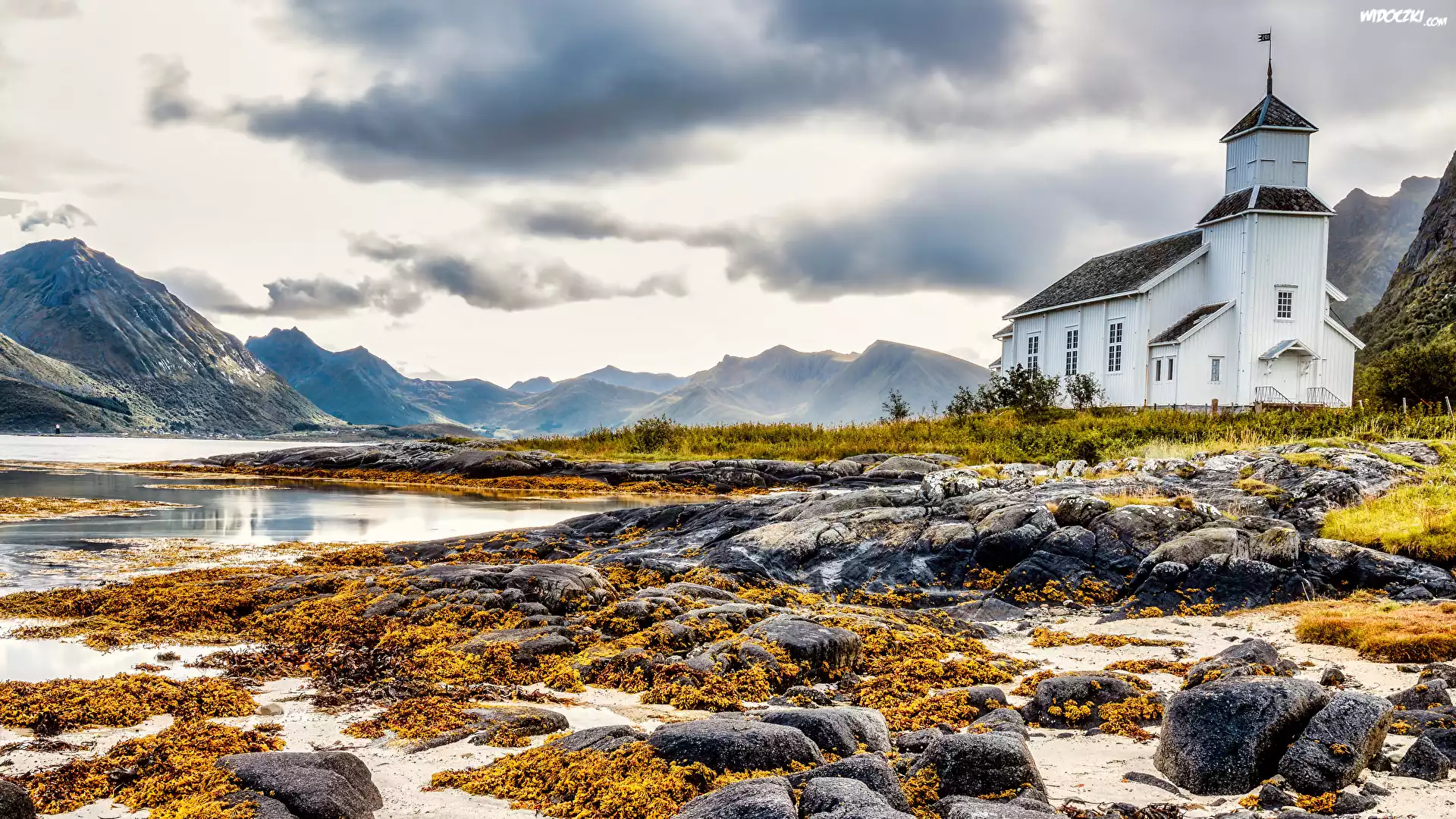 Zdjęcia, Kościół, Gimsoy Kirke, Jezioro, Kamienie, Trawa, Góry, Niebo, Vagan, Norwegia