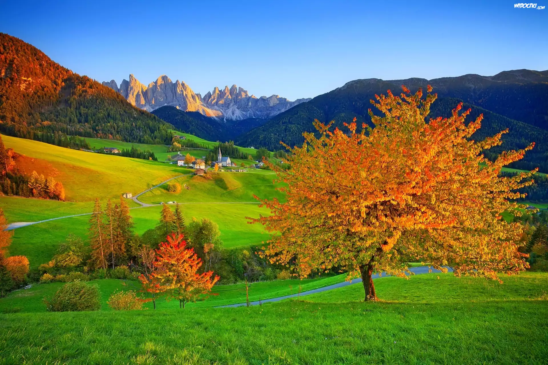 Zdjęcia, Wioska, Kościół, Droga, Lasy, Alpy, Szwajcaria, Jesień