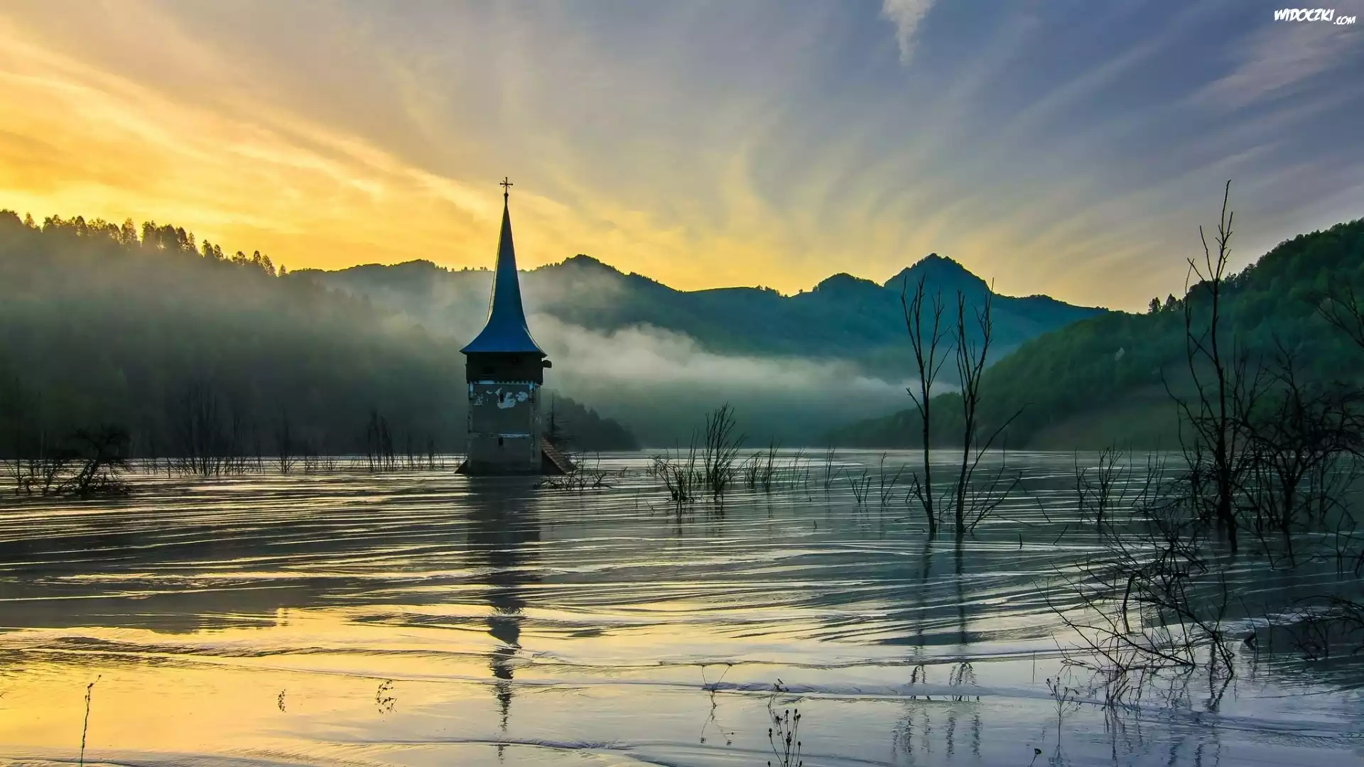 Zdjęcia, Kościół, Góry, Mgła, Świt, Powódź
