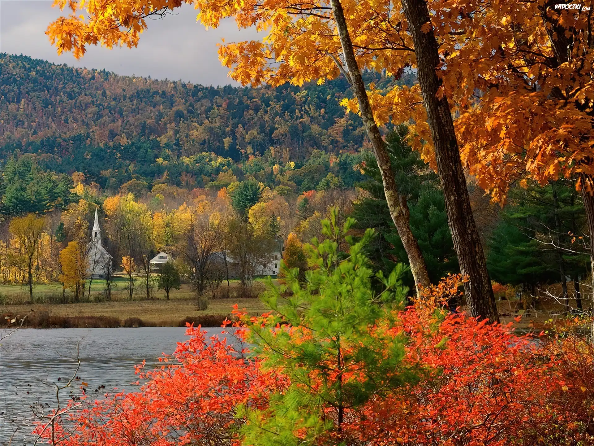 Zdjęcia, Kościółek, Rzeka, Kolorowe, Jesienne, Drzewa