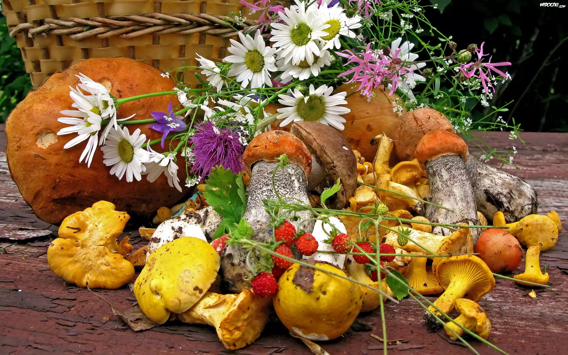 Zdjęcia, Grzyby, Kosz, Kwiaty