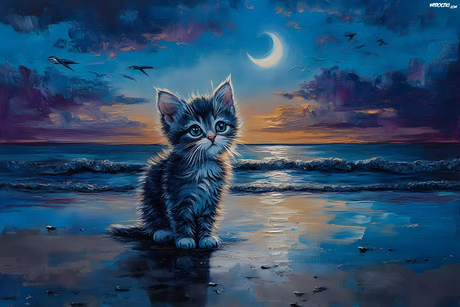 Morze, Kotek, Noc, Księżyc, Grafika