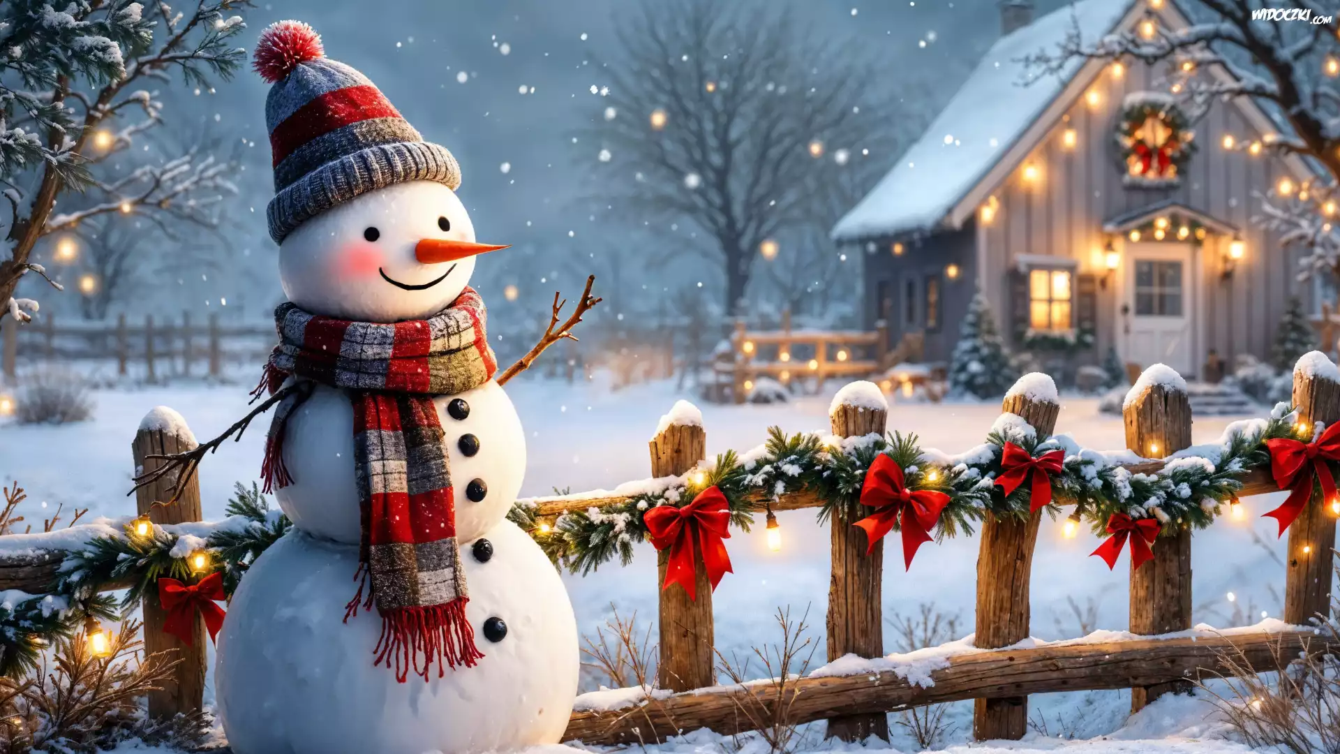 Zdjęcia, Zima, Bałwan, Czapka, Kraciasty, Szalik, Płot, Dom