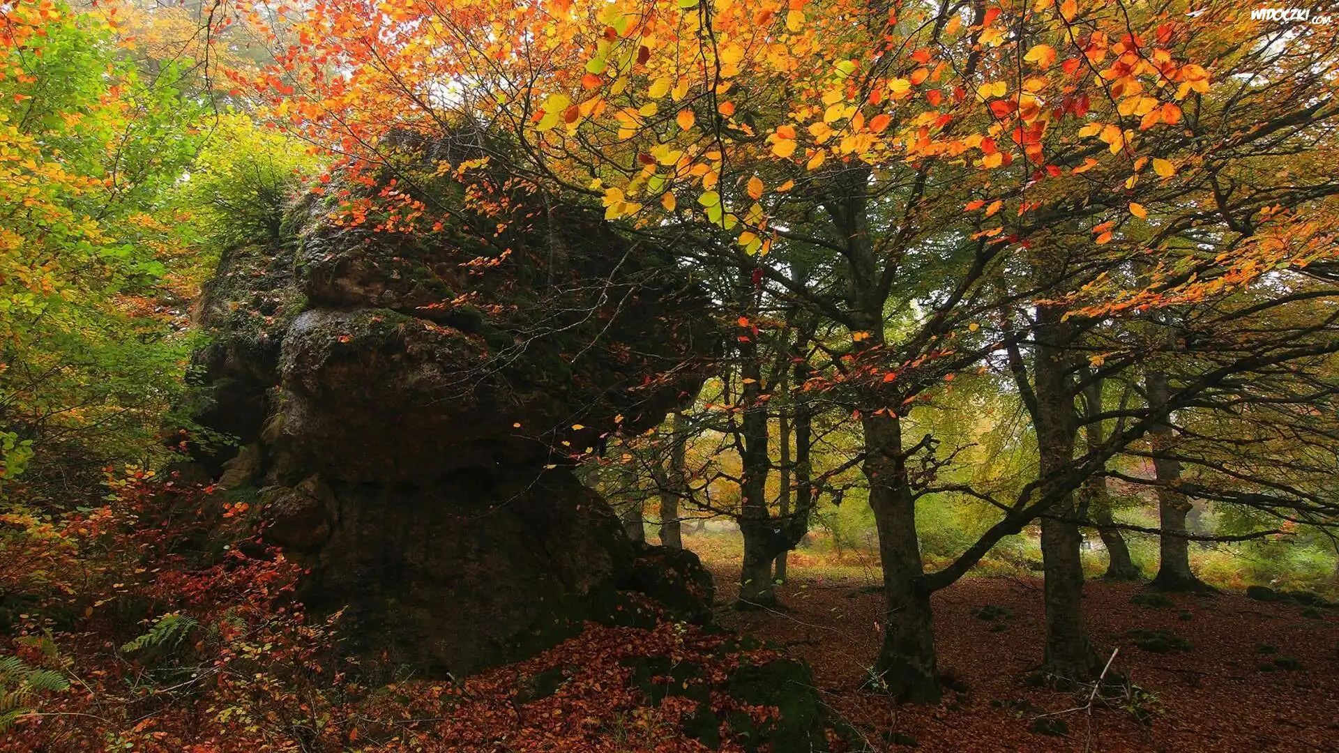 Hiszpania, Kraj Basków, Jesień, Drzewa, Skała, Liście