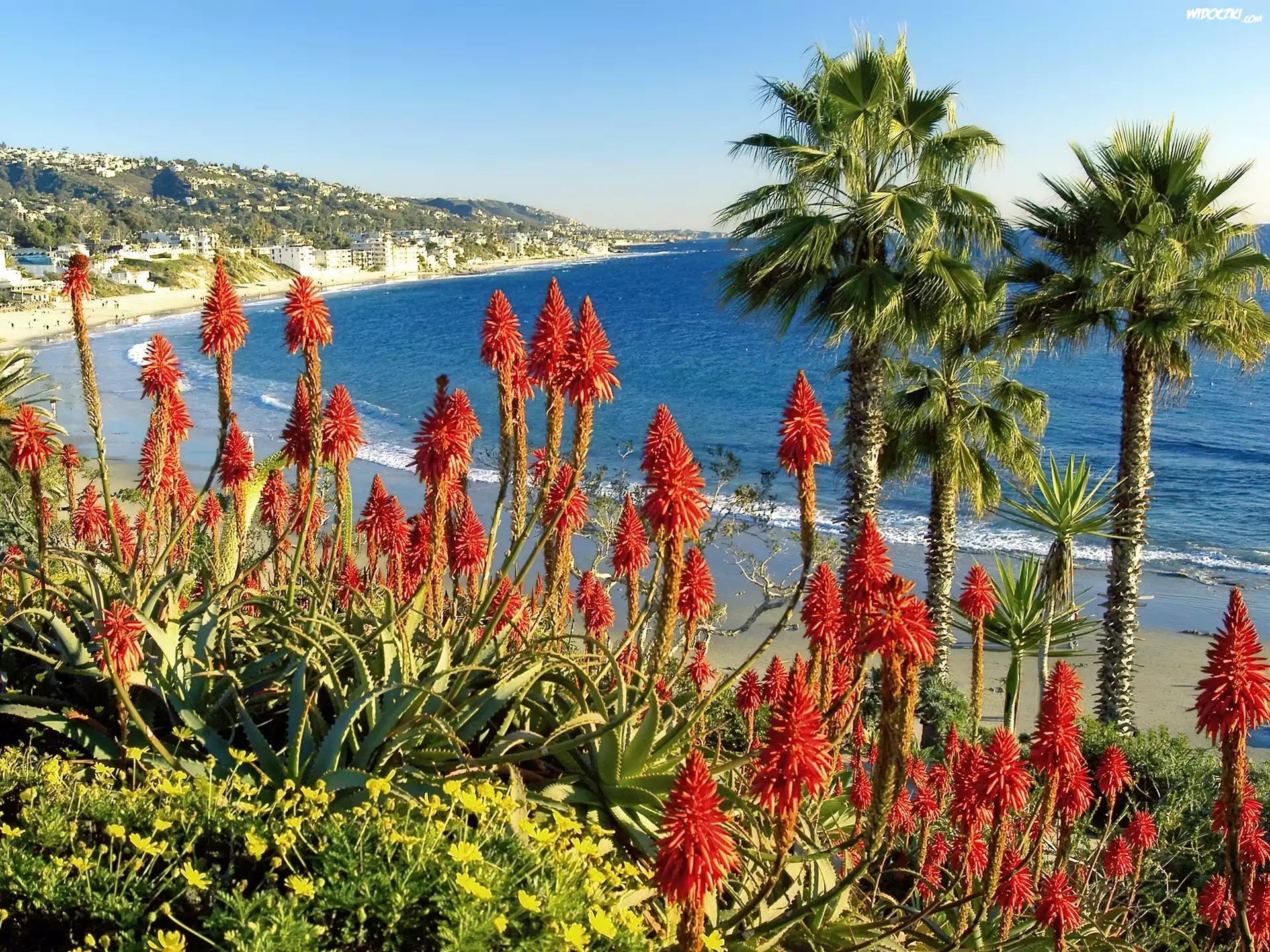Zdjęcia, Krajobraz, Morze, Palmy, Kwiaty