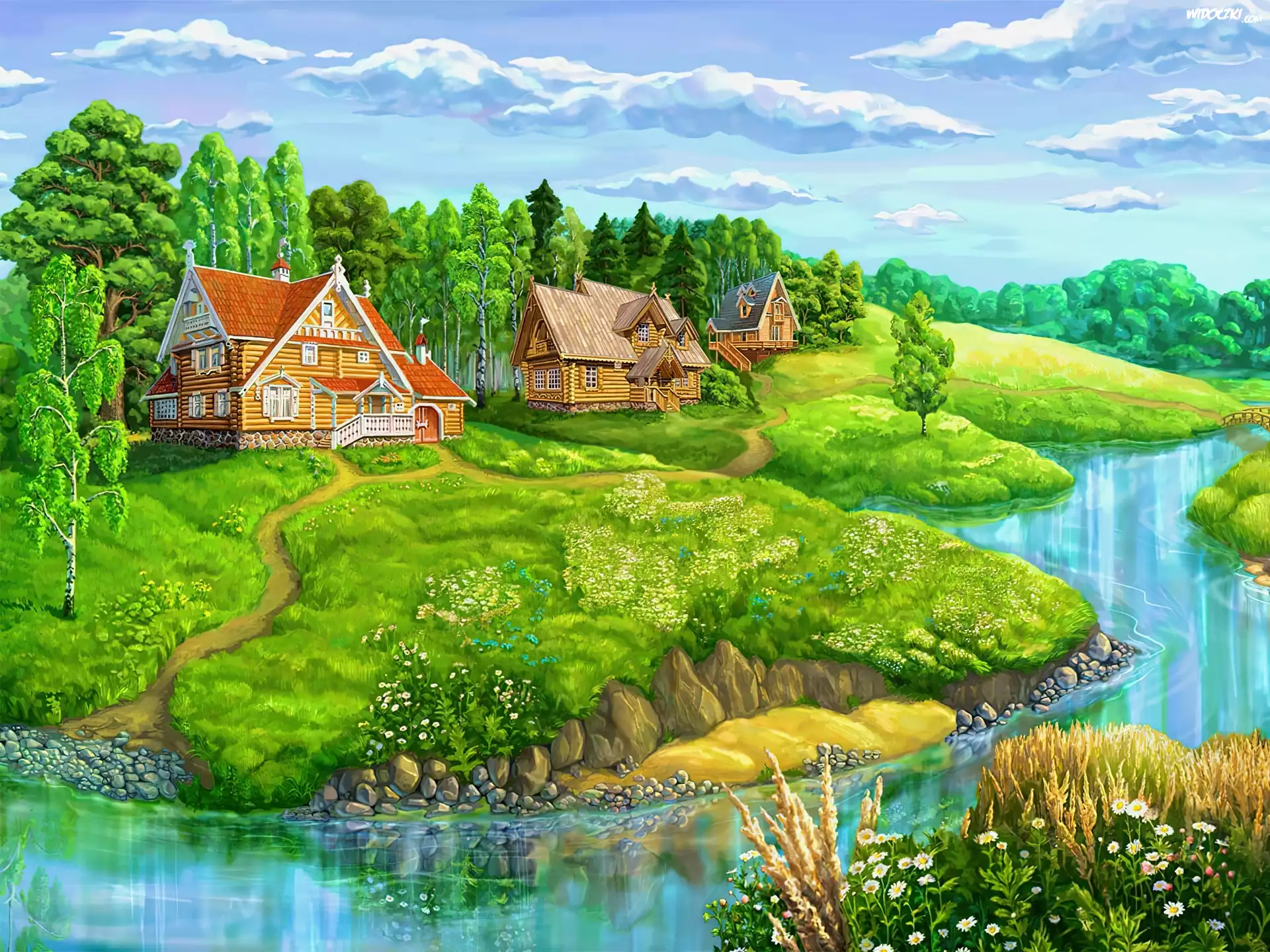 Zdjęcia, Krajobraz, Domki, Nad, Rzeką, Wieś